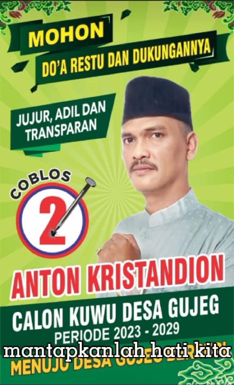 Cakades nomor urut 2, Anton Kristandion mengajak pada seluruh lapisan masyarakat pada saat nanti di pemilihan kepala desa pada tanggal 22, silahkan masyarakat memilih sesuai dengan pilihannya sesuai hak preogratif sebagai warga desa Gujeg. Memilih dan mendukung kepada siapapun silahkan demi menjaga ketertiban umum dan demi suksesnya acara pemilihan kepala desa Gujeg yang kondusif,” jelas Anton.