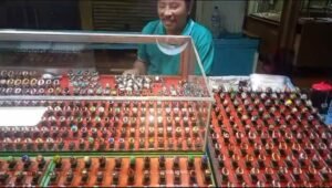 Barang yang dia jual ini memang batu cincing berbagai variasi dan ukuran yang sudah dibentuk menjadi aksesoris yang menarik. Pembelinya bisa memilih jenis batu yang disukai dengan berbagai variasi menarik dan indah.
