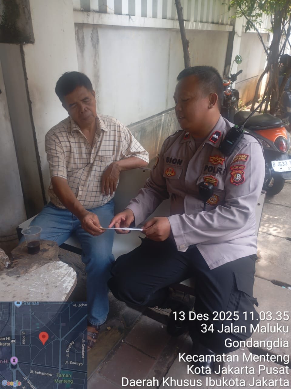 Jakarta Pusat – Dalam rangka meningkatkan partisipasi masyarakat serta mempercepat layanan kepolisian berbasis digital, anggota Samapta Polsek Metro Menteng bersama Aipda Dion Sinaga melaksanakan kegiatan sosialisasi Barcode Sahabat Patroli Polisi dengan menempelkan stiker barcode di sepanjang Jalan Maluku, Kelurahan Gondangdia, Kecamatan Menteng, Jakarta Pusat. Sabtu (13/12/2025)
