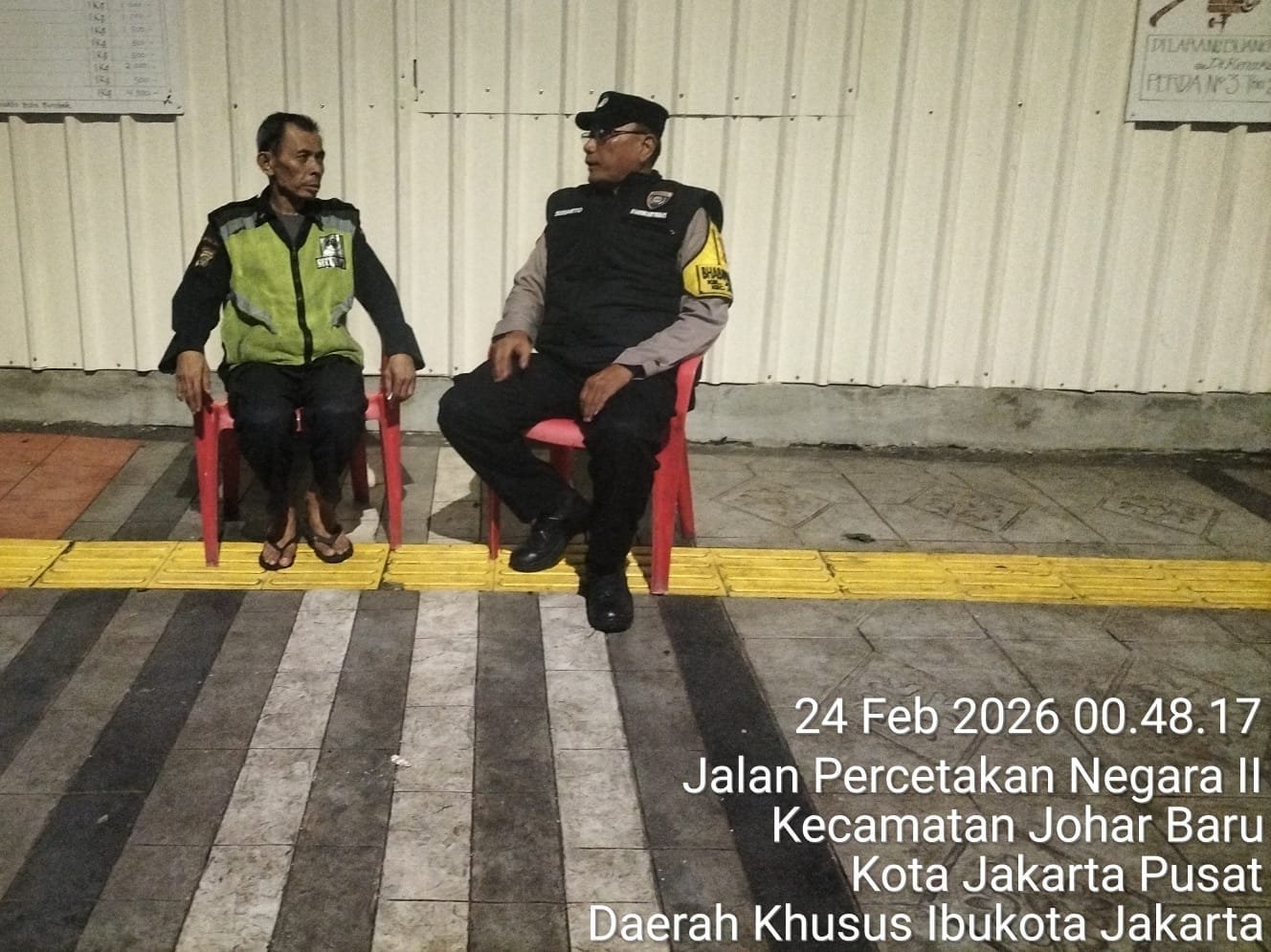 Jakarta Pusat – Dalam upaya menjaga situasi keamanan dan ketertiban masyarakat (kamtibmas) selama bulan suci Ramadhan, Bhabinkamtibmas Kelurahan Johar Baru melaksanakan kegiatan sambang dan cooling system di Pos Kamling RW 07, Jalan Percetakan Negara II, RW 07, Kelurahan Johar Baru, Kecamatan Johar Baru, Jakarta Pusat, Selasa (24/2/2026) pukul 01.30 WIB.