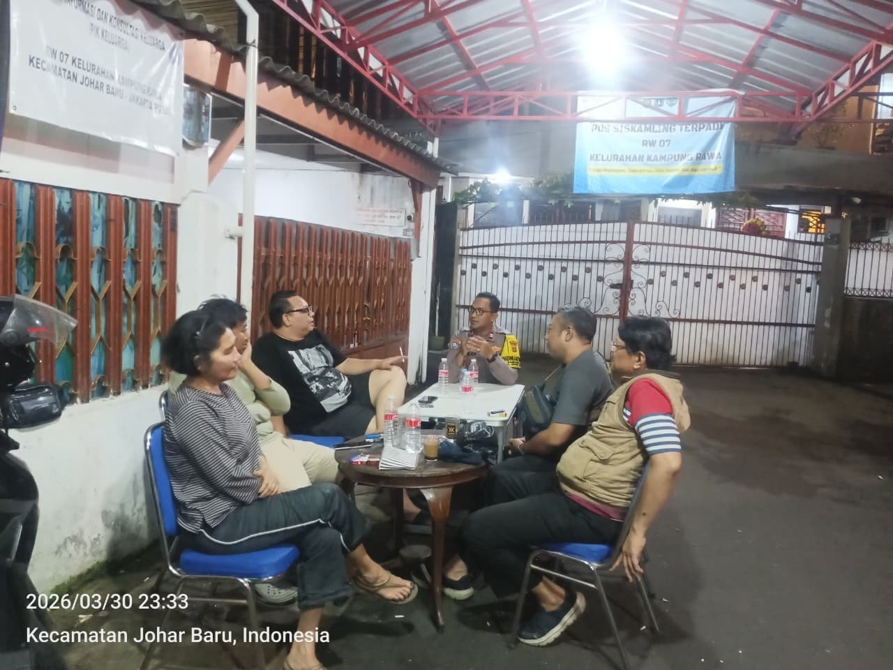 Jakarta Pusat – Guna menjaga keamanan dan ketertiban masyarakat (kamtibmas), jajaran Polsek Johar Baru melaksanakan patroli wilayah sekaligus sambang Pos Keamanan Lingkungan (Poskamling) di RW 07 Kelurahan Kampung Rawa, Kecamatan Johar Baru, Jakarta Pusat, pada Senin malam, 30 Maret 2026 pukul 23.33 WIB.
