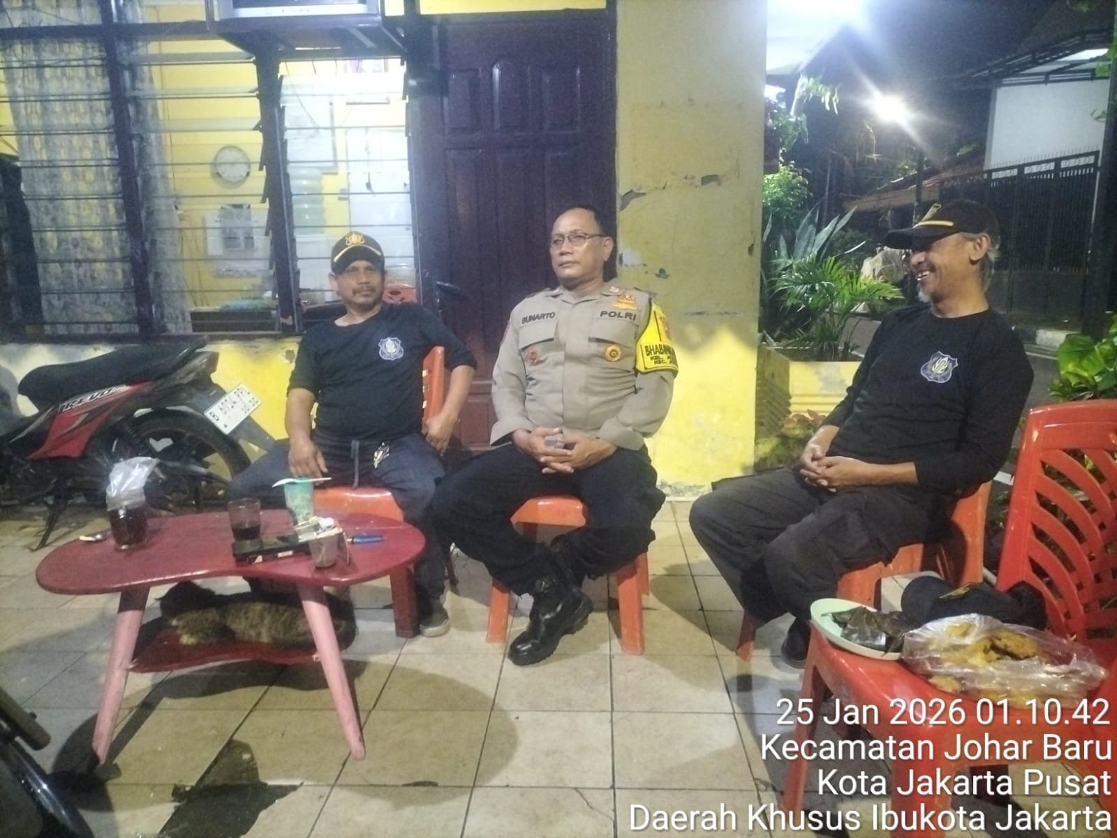 Kegiatan yang berlangsung mulai pukul 01.30 WIB tersebut dilaksanakan di Pos Kamling RW 09, Jalan Johar Baru I, oleh Bhabinkamtibmas Kelurahan Johar Baru Aiptu Sunarto. Dalam kesempatan itu, petugas bertemu langsung dengan awak Satkamling RW 09, Kuswanto dan Sadar, guna berdialog serta bertukar informasi terkait situasi keamanan lingkungan.