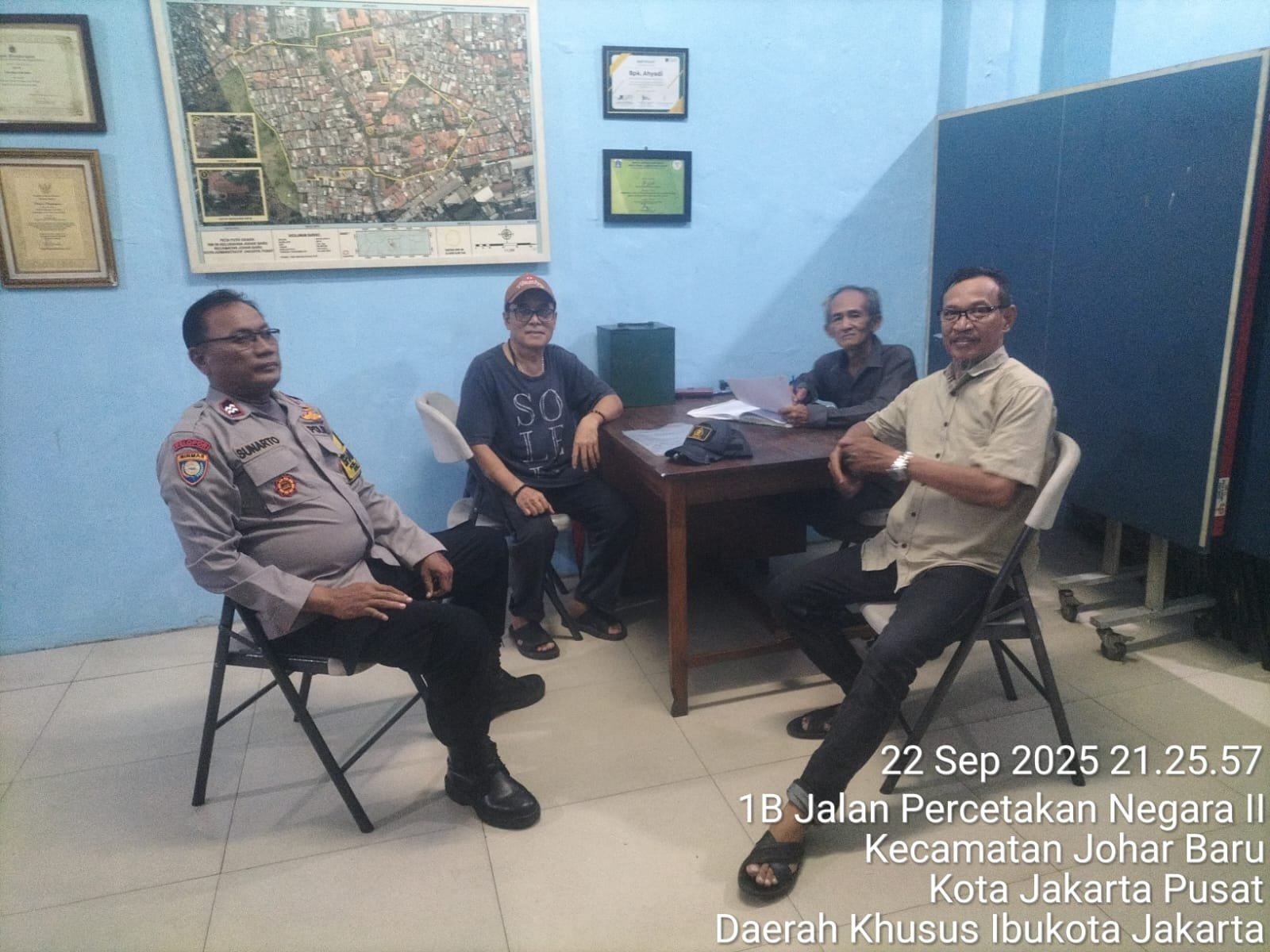 refubliknews.com, || Jakarta Pusat – Dalam rangka menjaga keamanan dan ketertiban masyarakat, Bhabinkamtibmas Kelurahan Johar Baru, Aiptu Sunarto, melaksanakan patroli dialogis dan sambang warga sekaligus cooling system di Sekretariat RW 06, Jl. Percetakan Negara II, Johar Baru, pada Senin malam (22/9/2025) pukul 21.30 WIB.