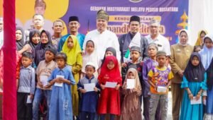 Ketua PD Al- Washliyah Ustadz Batubara Al Asari, Ketua Pujakesuma Batubara DR H Hadi Suriono, SE, MM santuni anak yatim ketika digelar Kenduri Mogang dan Mandi Belimau, Selasa (25/2/2025) di Halaman Objek Wisata Mangrove Park, Pantai Sejarah, Desa Perupuk, Kec Limapuluh Pesisir, Batubara.Foto:/Liberti H Haloho