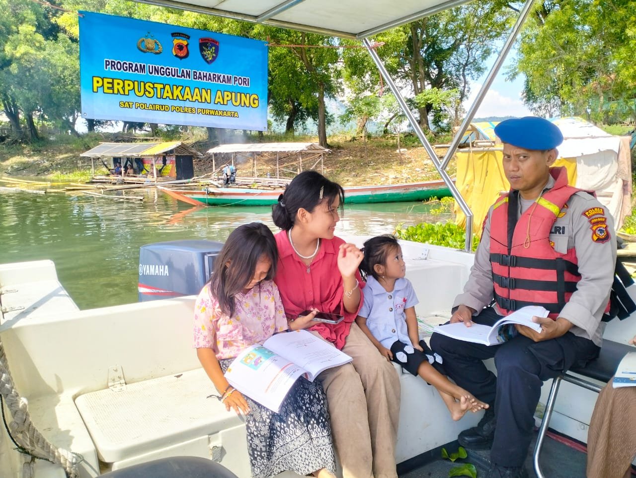 Pureakarta – Untuk mencerdaskan anak-anak nelayan di perairan Waduk Jatiluhur, Kapal milik Satuan Polisi Perairan dan Udara (Satpolairud) Polres Purwakarta, Polda Jawa Barat, dijadikan perpustakaan terapung saat patroli.