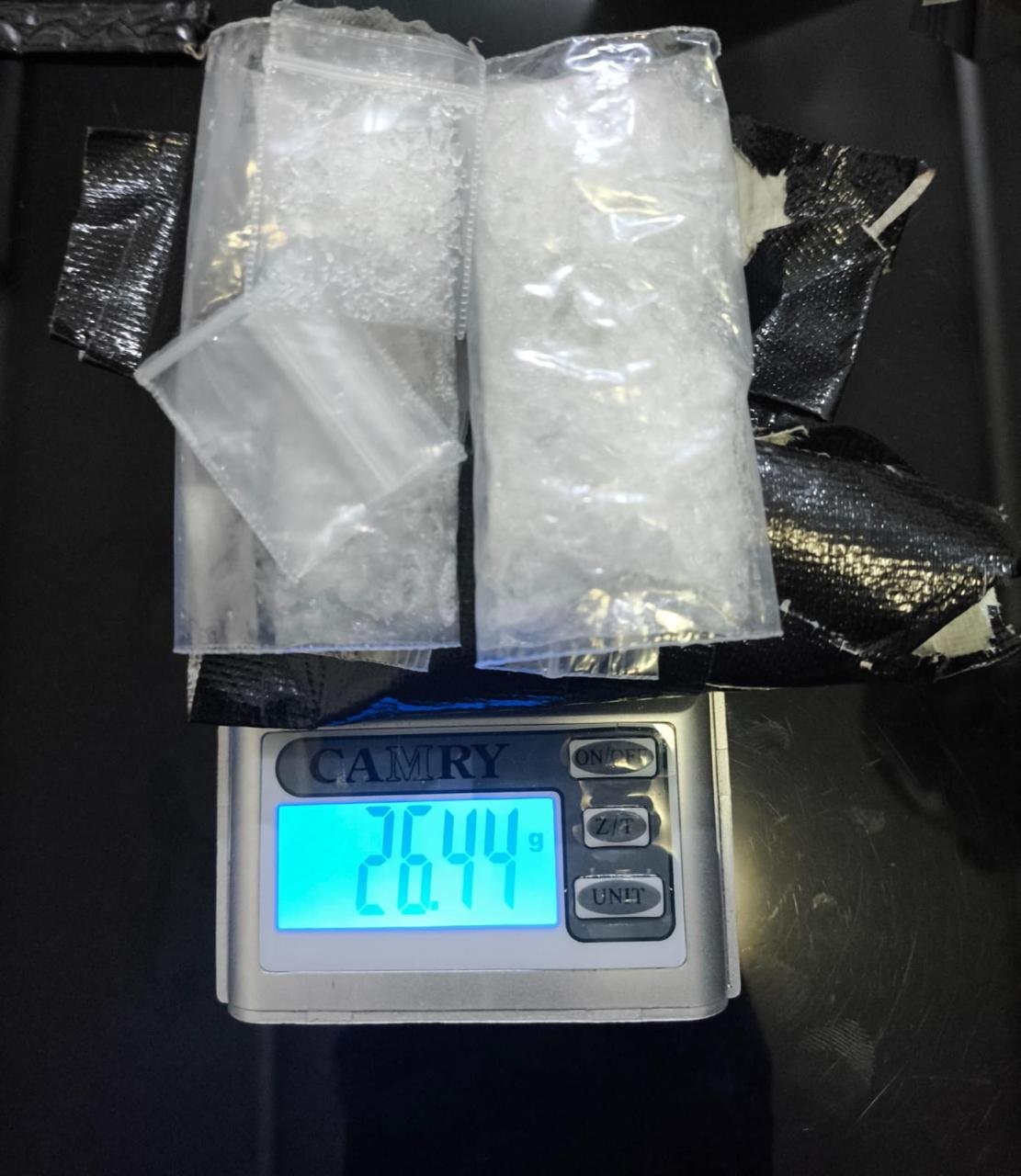 “Setelah dilakukan penggeledahan dikamar terduga pelaku, personel kami menemukan sebuah dompet kecil warna hitam didalamnya terdapat dua bungkus lakban warna hitam masing-masing didalamnya berisikan sebungkus plastik klip bening berisi kristal warna putih diduga narkotika jenis sabu dan dua bungkus plastik klip bening masing-masing berisikan kristal warna putih diduga narkotika jenis sabu. Jadi anggota kami berhasil mengamankan narkoba jenis sabu dengan berat bruto 26,44 gram yang akan diedarkan pelaku,” Jelas Yudi.