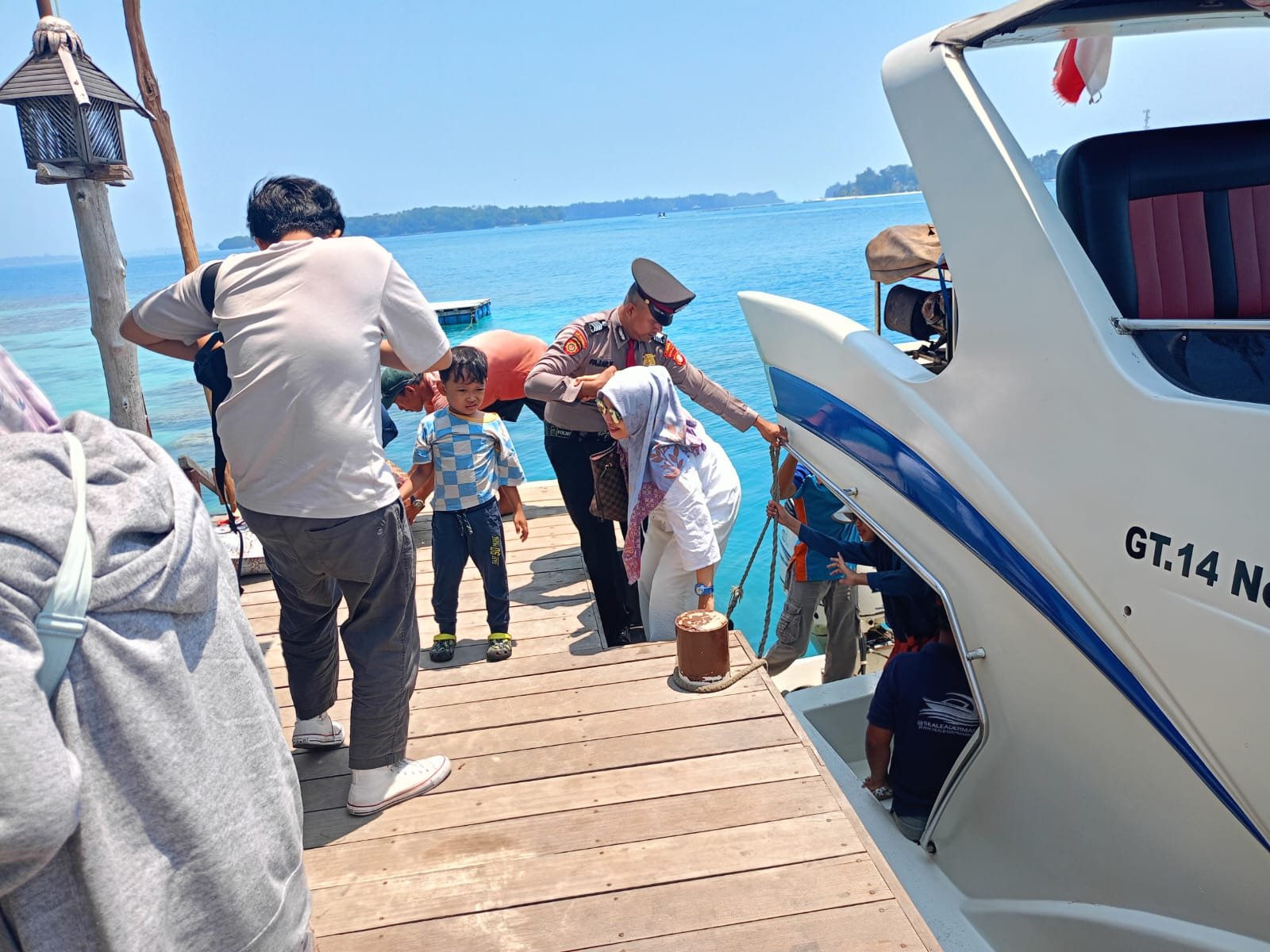 Jakarta – Satuan Pam Obvit Polres Kepulauan Seribu melaksanakan kegiatan pengamanan rutin kedatangan wisatawan di Pulau Macan, Kepulauan Seribu Utara, Kamis (25/01/2024). Dalam upaya memberikan pelayanan yang humanis, anggota Satuan Pam Obvit dengan sigap memberikan bantuan kepada wisatawan saat turun dari kapal.