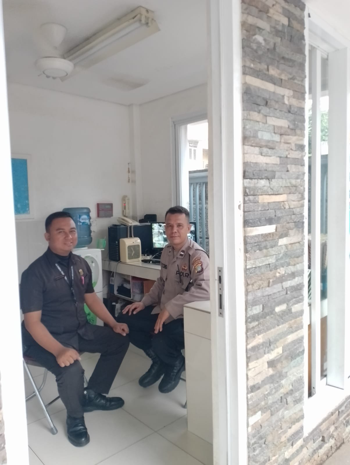 Dalam patroli tersebut, Aipda Parhan disambut oleh Bapak Jumadi, petugas keamanan sekolah. Mereka berdiskusi mengenai prosedur pengawasan tamu, jam rawan di sekitar sekolah, serta sistem tanggap darurat apabila terjadi gangguan.