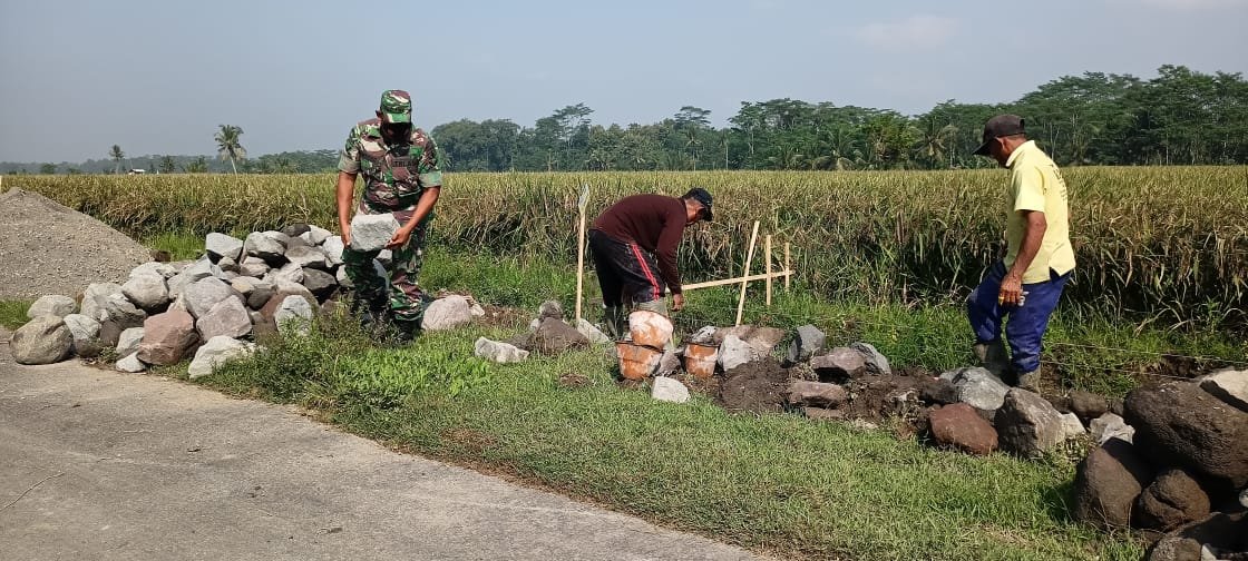 Babinsa Koramil 0808/12 Wlingi Kodim 0808/Blitar Serda Santoso, melaksanakan kegiatan gotong royong membantu warga dalam pembuatan saluran irigasi yang menuju ke lahan persawahan masyarakat, bertempat di Kelurahan Babadan Kecamatan Wlingi Kabupaten Blitar, Senin (06/03/2023).