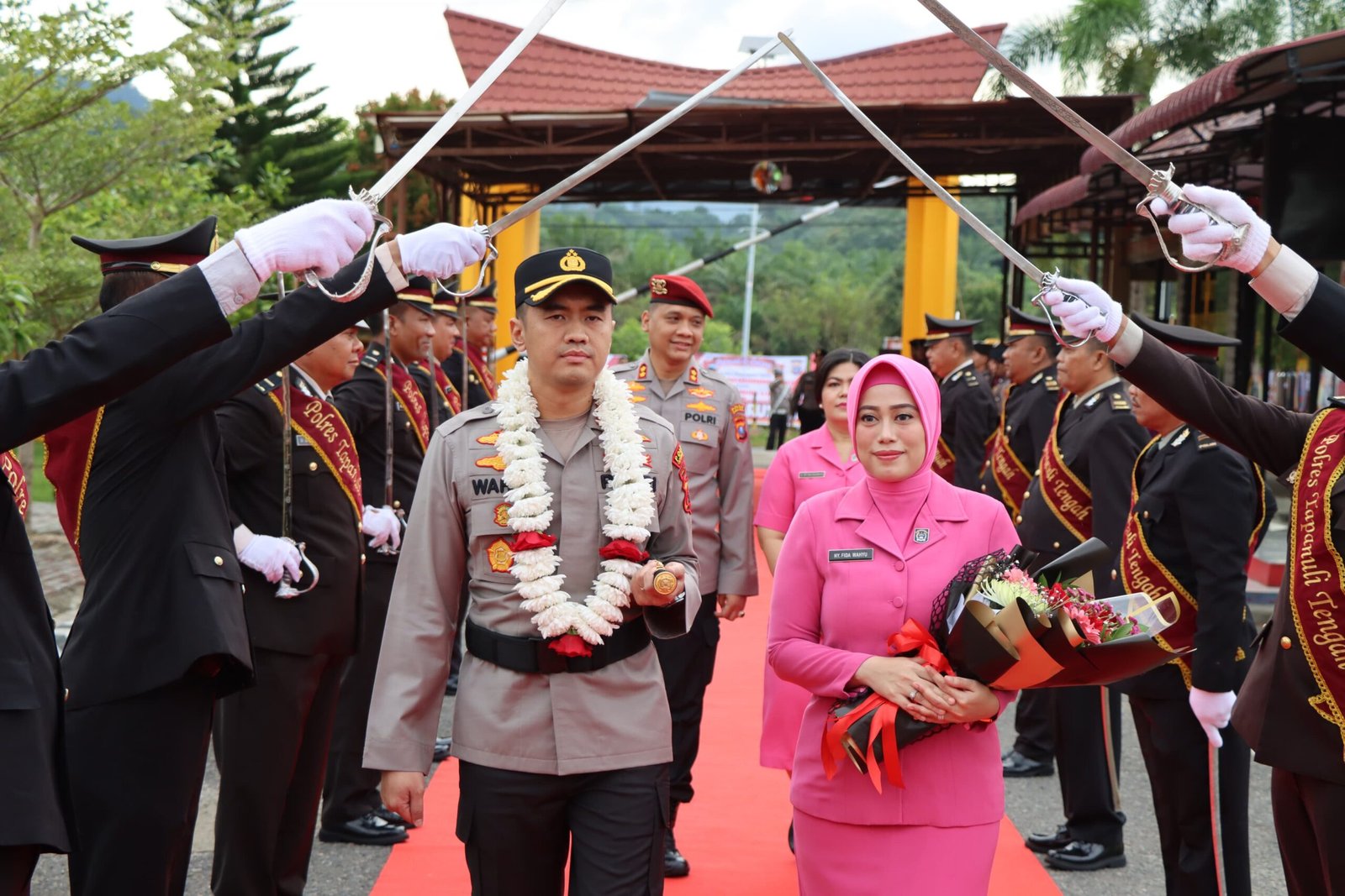 refubliknews.com,-TAPTENG Setelah serah terima jabatan (Sertijab) di Polda Sumut, Kapolres Tapteng AKBP Wahyu Endrajaya dan istri tiba di Mapolres Tapteng, Jumat (17/1/2025) pagi disambut tradisi Pedang Pora oleh personel Polres Tapteng.