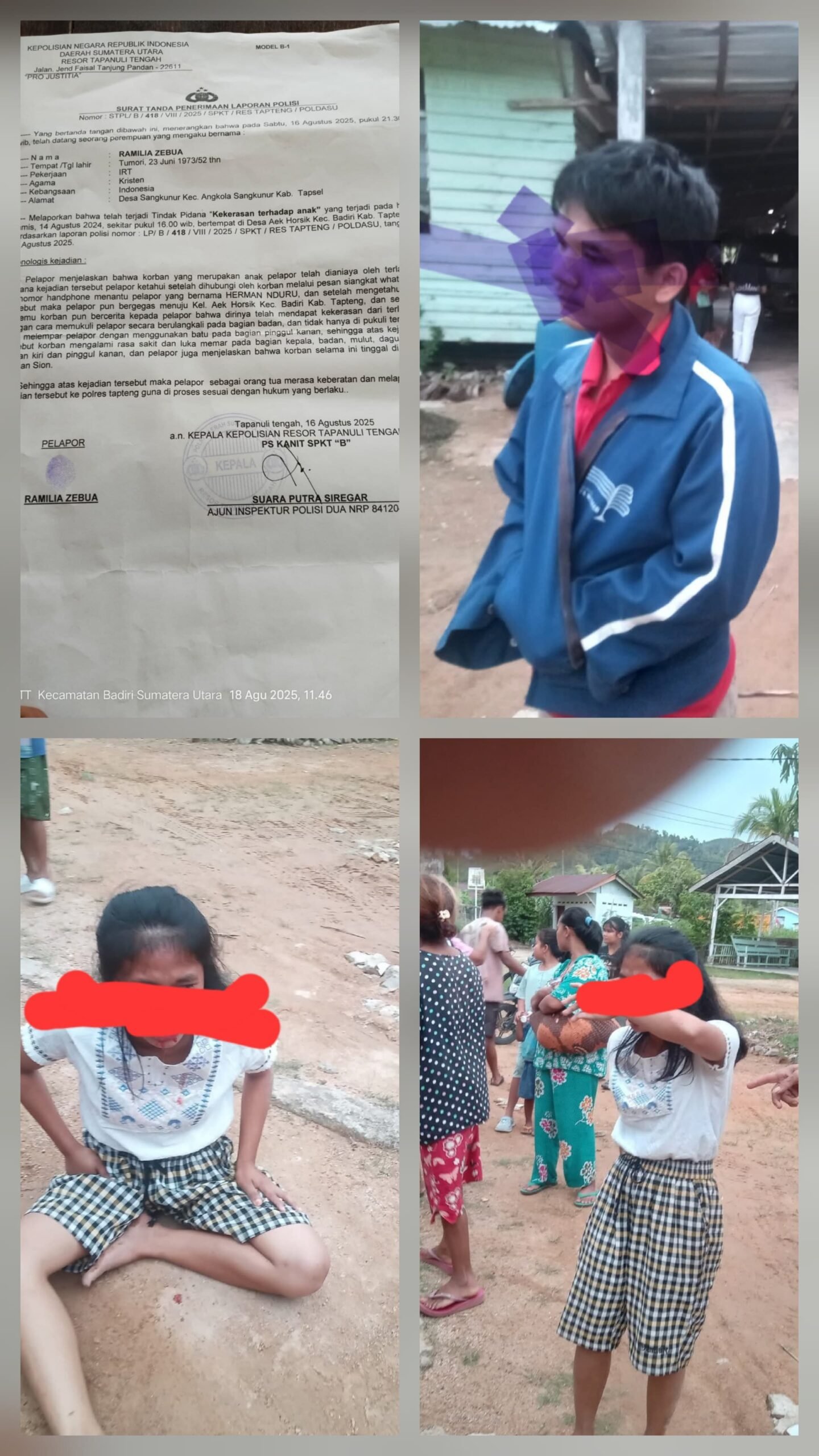 Di keterangan Orang tua korban, diwakili pamannya saat dimintai keterangan, menjelaskan bahwa kejadian ini kepada anak mereka. Tidak Senang dan sudah melakukan tahap Mediasi secara kekeluargaan, pemerintahan, Polsek setempat namun tidak ada itikad baik sehingga kami sepakat untuk melanjutkan kasus ini kerana Hukum dan telah membuat laporan polisi (LP) Nomor : LP/B/418/VIII/2025/SPKT/RES TAPTENG/POLDASU tanggal 16 Agustus 2025. Atas nama Ramilia Zebua Selaku orang tua Kadung dari Korban. Dan pihak penyidik menyampaikan untuk menunggu informasi selanjutnya. Keluarga mengharapkan keadilan agar hal yang terjadi kepada anaknya bisa di proses secepatnya dan sesuai hukum yang berlaku.