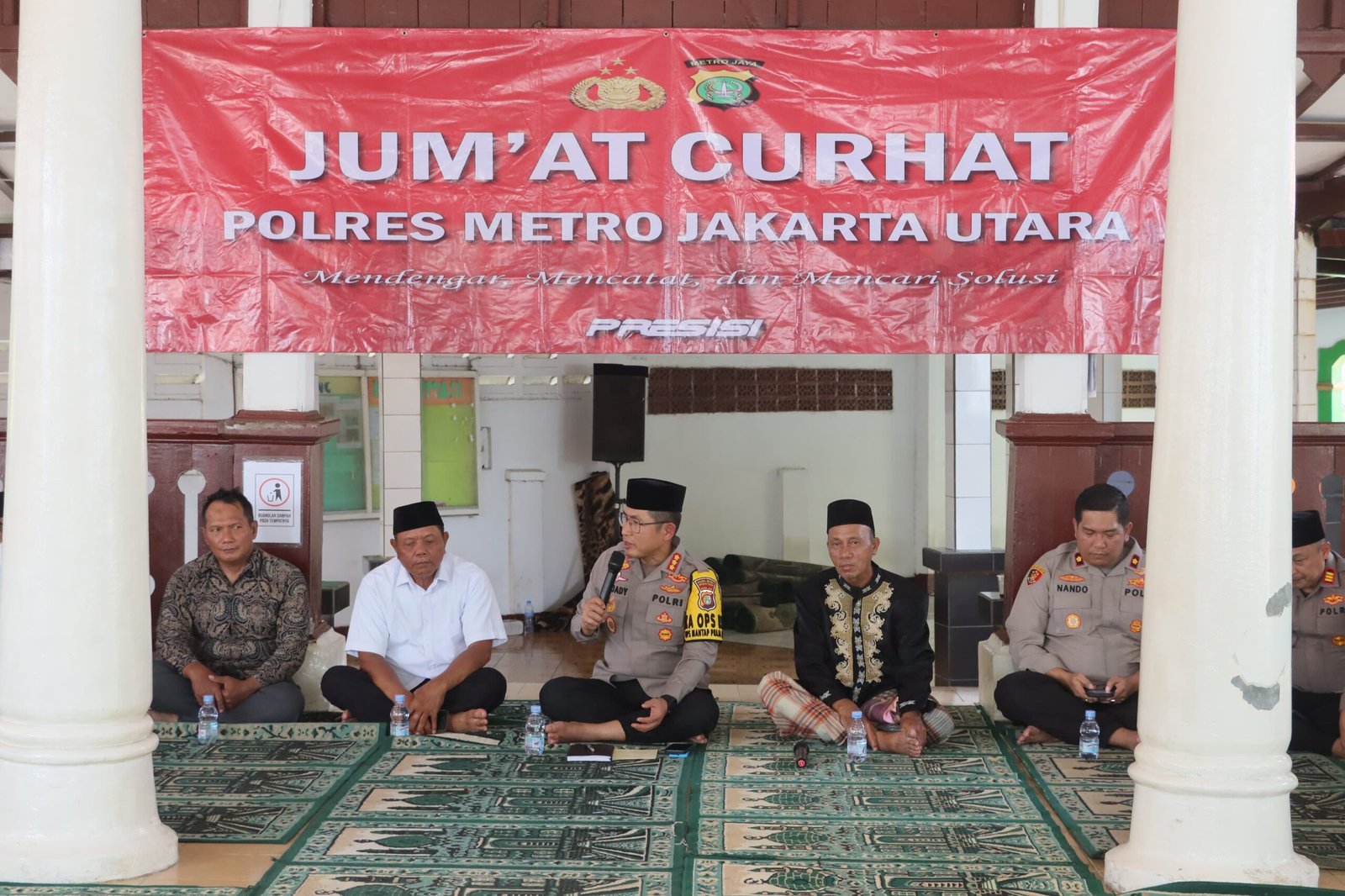 refubliknews.com,- JAKARTA – Kapolres Metro Jakarta Utara Kombes Pol H. Ahmad Fuady melakukan kegiatan Jumat Curhat di Masjid Al-Alam Marunda, Cilincing, Jakarta Utara. Kegiatan ini dilakukan usai melaksanakan salat Jumat, bertujuan untuk mendengarkan aspirasi, kritik, dan saran dari masyarakat terkait keamanan dan ketertiban lingkungan, Jumat (27/12/2024).