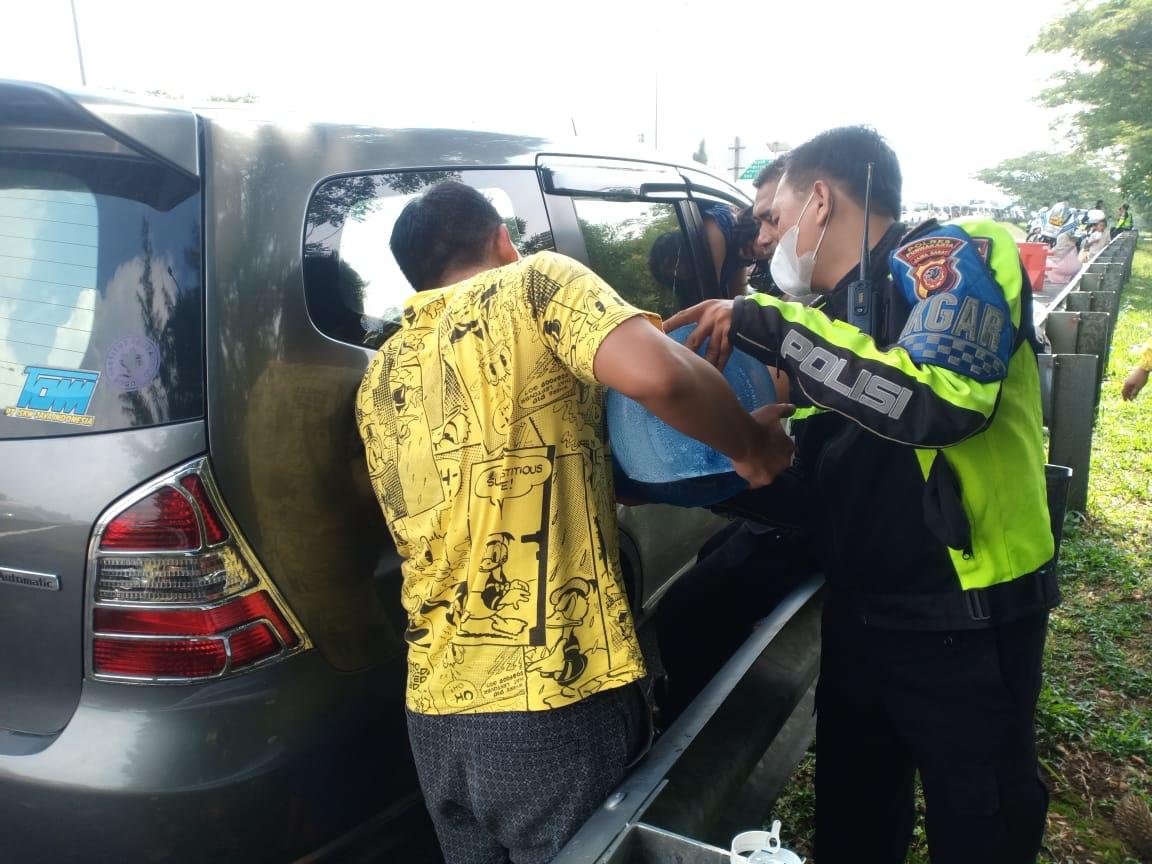 Purwakarta, -Anggota Kepolisian Polres Purwakarta membantu pemudik yang kehabisan Bahan Bakar Minyak (BBM) di kilometer 72 Tol Cipali arah jakarta.