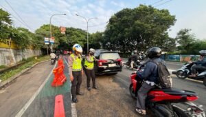 Depok – Anggota Satuan Lalu Lintas (Sat Lantas) Polres Metro Depok turun ke lapangan untuk membersihkan tumpahan oli yang mengancam keselamatan pengendara di Jalan Juanda, Depok.