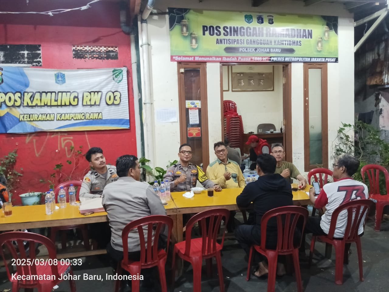 refubliknews.com, – Jakarta Pusat – Dalam rangka menciptakan rasa aman dan nyaman bagi umat Muslim yang menjalankan ibadah selama bulan suci Ramadhan, Polsek Johar Baru bersama dengan tokoh masyarakat setempat bersinergi untuk mengamankan Pos Singgah Ramadhan 1446 H yang terletak di Jalan T RW 03 Kelurahan Kampung Rawa, Kecamatan Johar Baru Jakarta Pusat. Sabtu (08/03/2025).