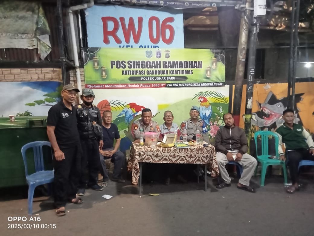 refubliknews.com, – Jakarta Pusat – Pada hari Senin dini hari, tanggal 10 Maret 2025, pukul 00.15 WIB, dalam rangka memastikan kelancaran dan keamanan selama bulan Ramadhan, Unit Samapta Polsek Johar Baru Aiptu Afrizal Harahap, Bhabinkamtibmas Aiptu Baktiar Emri, Anggota Propam Aipda Delon dan Anggota Intelkam Brigadir Imam serta Perangkat Wilayah Ketua RW 06 Suroso, FKDM, LMK, Pokdarkamtibmas dan PPSU, melakukan pemantauan bersama di Pos Singgah Ramadhan RW 06 Galur. Jalan Rawa Tengah RT 08 RW 06 Kelurahan Galur, Kecamatan Johar Baru Jakarta Pusat.