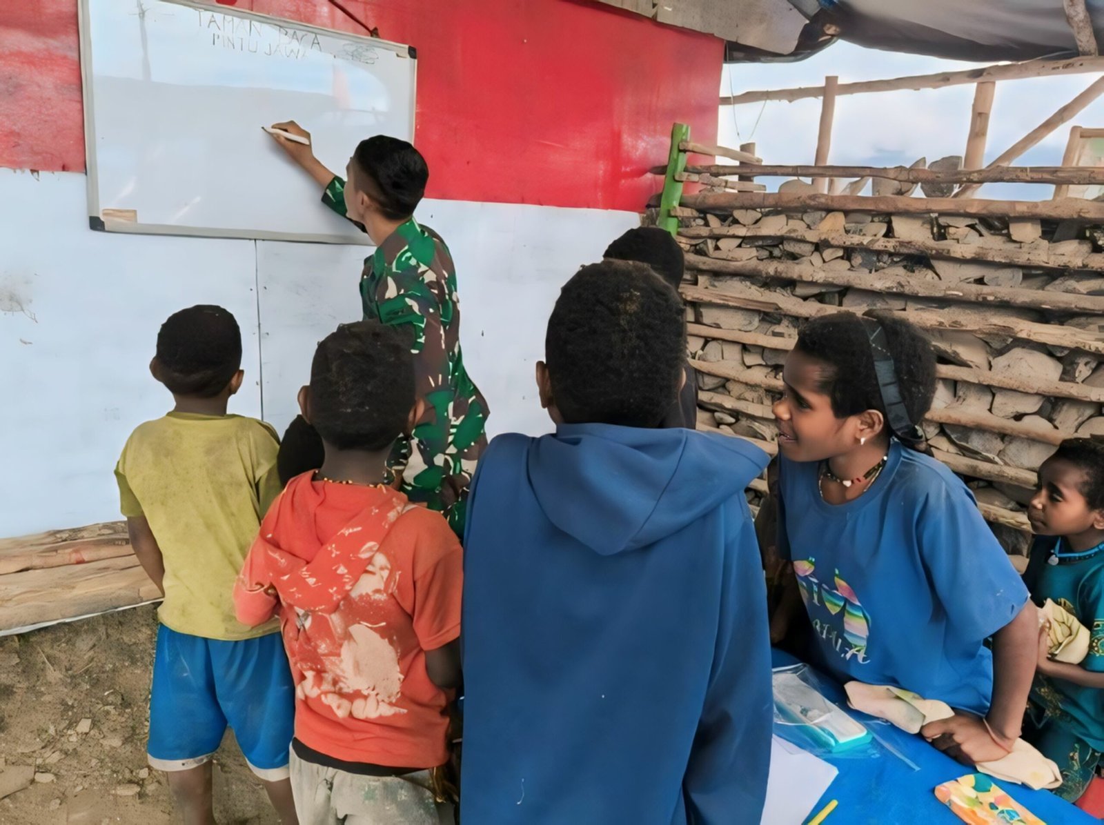 JAKARTA,- Prajurit Satgas Pamtas Mobile Yonif 323 Buaya Putih Kostrad, Koops Habema pimpinan Lettu Inf Arif Caroko mengajar anak-anak dari Kp. Wombru dan Kp. Bionidikime, Kabupaten Puncak, Papua.
