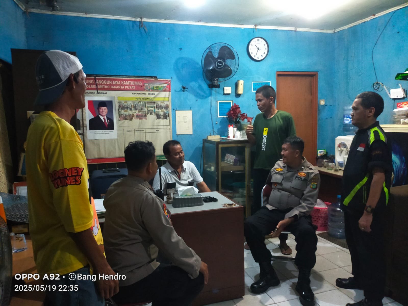 refubliknews.com, || Jakarta Pusat – Guna memperkuat keamanan lingkungan dan mencegah aksi premanisme, jajaran Polsek Senen bersama Bhabinkamtibmas Kelurahan Kramat dan Bapospol Pasar Gaplok melaksanakan kegiatan sambang siskamling di Pos Kamling RW 07, Kelurahan Kramat, Kecamatan Senen, Jakarta Pusat, Senin (19/5/2025) malam.