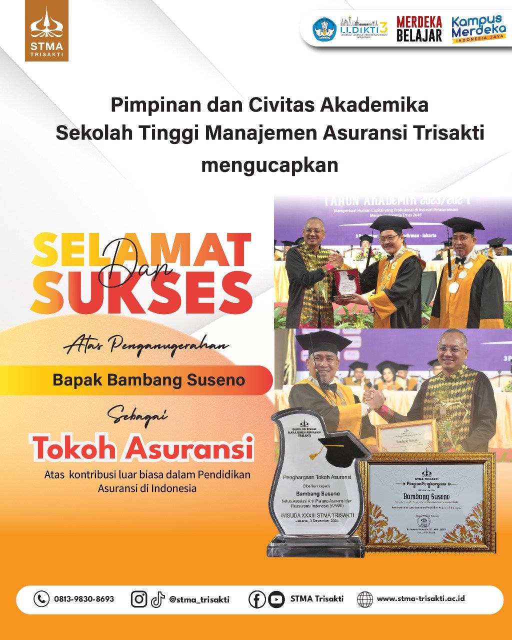 Pada wisuda XXXIII kali ini juga diberikan piagam penghargaan kepada Bambang Suseno sebagai tokoh asuransi yang telah memberikan banyak kontribusi untuk kemajuan pendidikan asuransi di Indonesia.