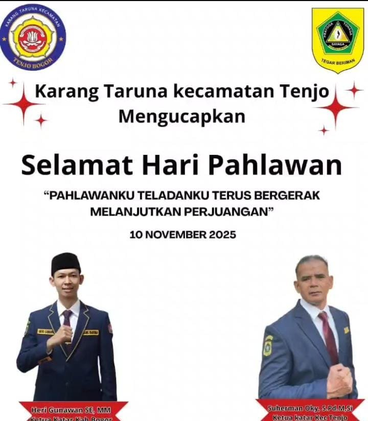 Suherman Oki Ketua Karang Taruna Kecamatan Tenjo mengucapkan selamat Hari Pahlawan, yang diperingati setiap 10 November, ketua Suherman Oki menjelaskan bahwa” untuk mengenang perjuangan dahulu di kota Surabaya 1945 sebagai simbol perjuangan dan pengorbanan para pahlawan dalam mempertahankan kemerdekaan Indonesia, serta semangat juang tanpa kenal menyerah yang ditunjukkan oleh rakyat Surabaya saat itu. Kota Surabaya sendiri dikenang sebagai “kota pahlawan” karena keberanian dan pengorbanan warganya selama pertempuran tersebut. Peringatan ini menumbuhkan rasa cinta tanah air dan nasionalisme, terutama di kalangan generasi muda, agar lebih menghargai kemerdekaan yang diperoleh dengan susah payah. Selain itu, Hari Pahlawan mengajarkan nilai-nilai keberanian, keteladanan, dan semangat pantang menyerah, serta memotivasi generasi muda untuk berkontribusi dalam memajukan negara melalui berbagai bidang seperti pendidikan, seni, dan inovasi. Secara keseluruhan, peringatan ini mengingatkan masyarakat untuk selalu menghargai jasa para pejuang yang telah berjuang demi kemerdekaan bangsa dan kamipun karang taruna kecamatan Tenjo selalu mensupport berbagai kegiatan para pemuda terutama dalam mengembangkan bakat dan kreativitasnya,” Ungkapnya.