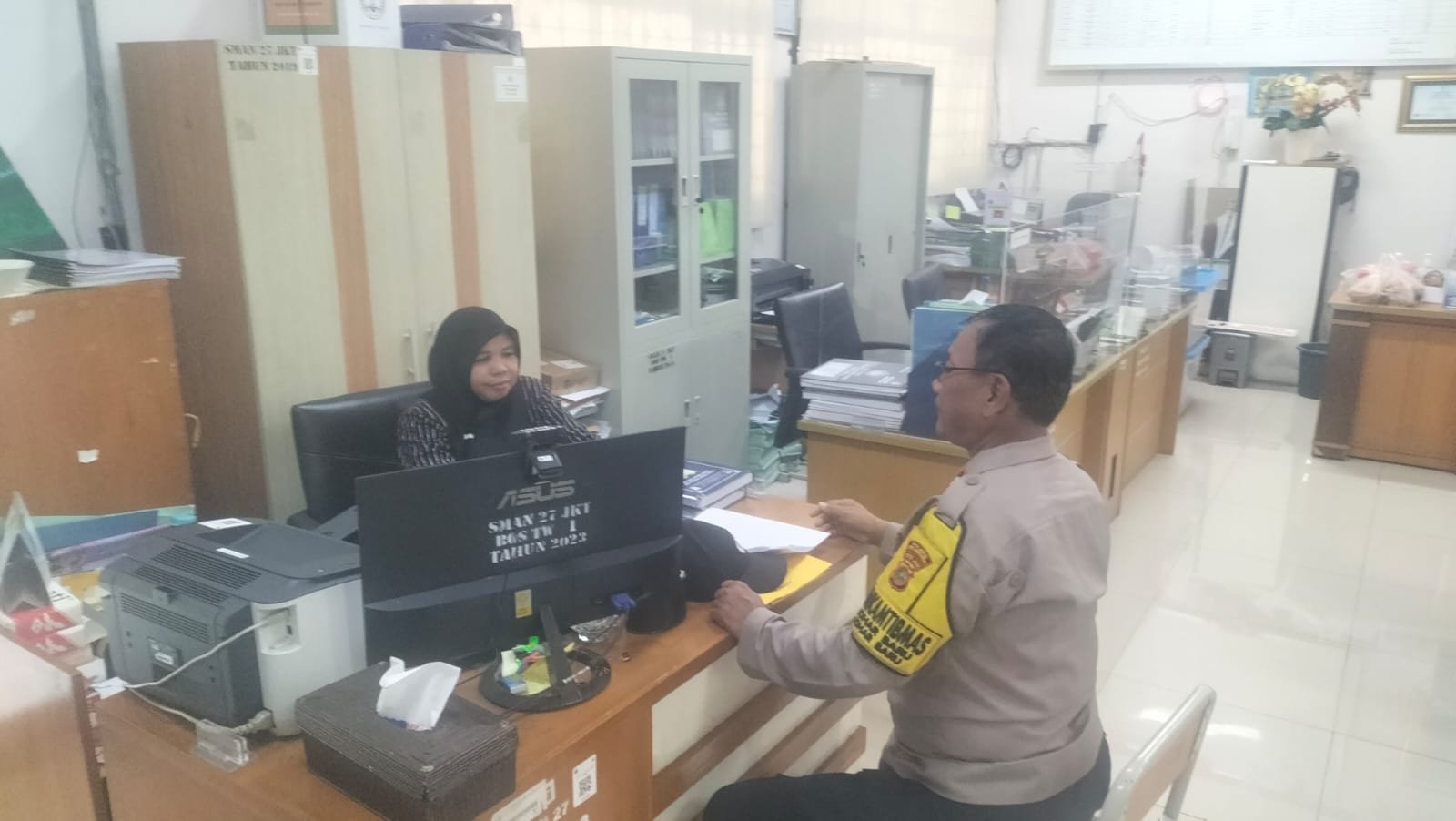 Bertemu dengan Ibu Lesti, Guru Kesiswaan di SMA N 27, Aiptu Sunarto memberikan himbauan penting kepada seluruh warga sekolah. “Setelah bubaran sekolah, kami menghimbau agar para siswa langsung pulang ke rumah dan tidak berkumpul di luar untuk menghindari potensi kerumunan yang bisa menimbulkan gangguan keamanan,” ujar Aiptu Sunarto.