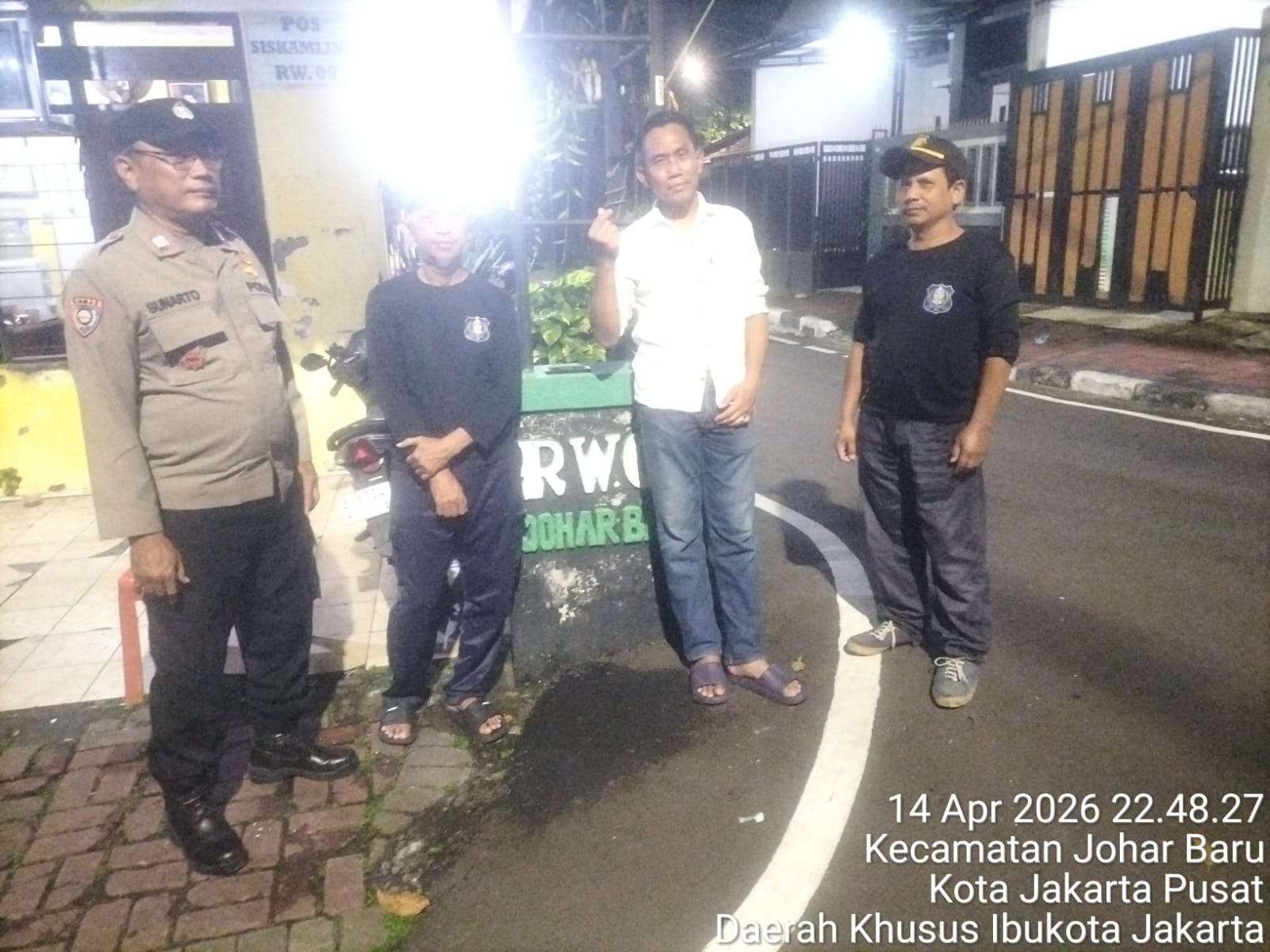 Kegiatan tersebut dipimpin oleh Aiptu Sunarto selaku Bhabinkamtibmas Kelurahan Johar Baru. Dalam sambangnya, petugas berdialog langsung dengan awak Poskamling, yakni Bapak Sadar dan Bapak Kuswanto, guna mempererat sinergi serta menyampaikan pesan-pesan kamtibmas.