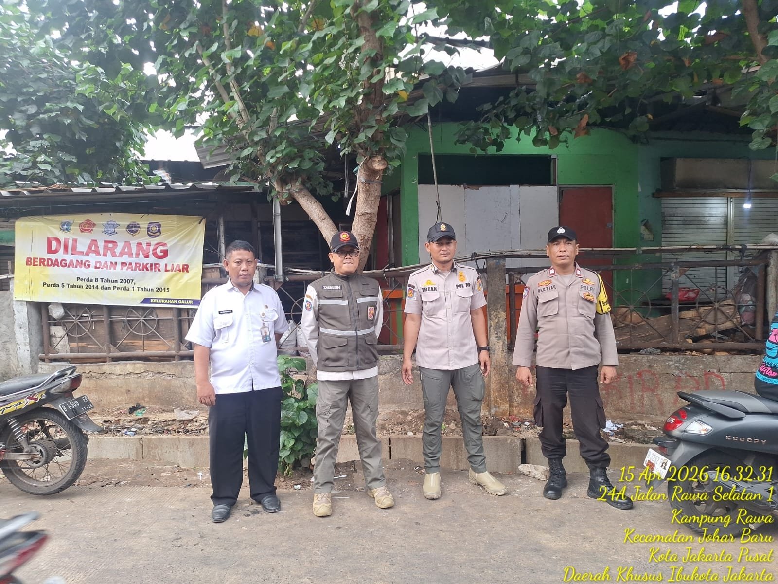 Kegiatan berlangsung di Jalan Rawa Selatan 1, tepatnya di samping Pasar Gembrong. Bhabinkamtibmas Kelurahan Galur, Aiptu Baktiar, bersama Satpol PP Kelurahan Galur yang dipimpin Irfan dengan kekuatan 3 personel, turut didukung ASN Kelurahan serta FKDM setempat.