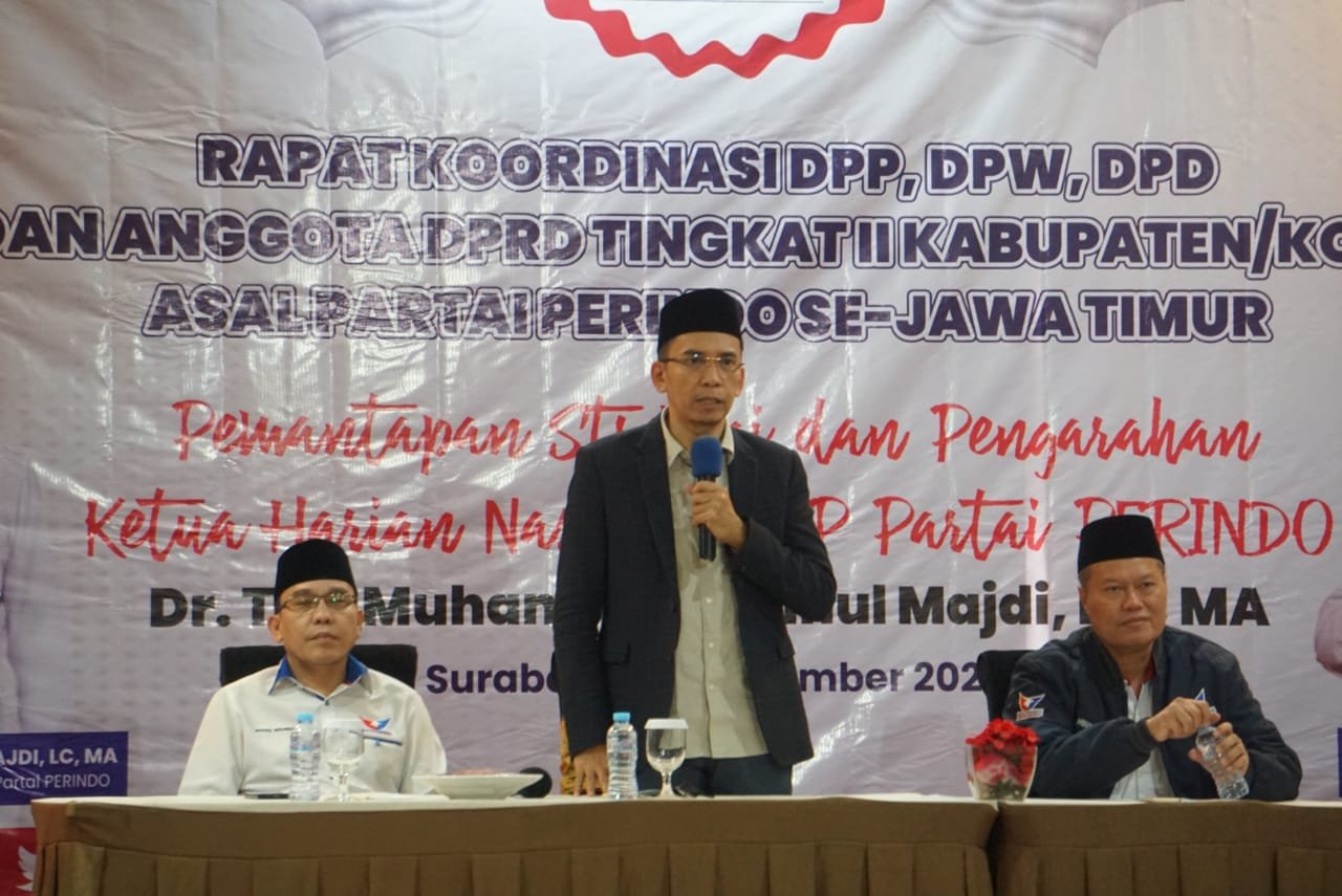 TGB memberikan contoh dj Jawa Timur, daerah ini memiliki pertumbuhan ekonomi tinggi. Pertumbuhan ekonomi yang tinggi seiring dengan problem masalah sosial dan ekonomi. Caleg Perindo harus buka telinga, isu yang perlu diadvokasi, didampingi, bila perlu ditemani dan didampingi.
