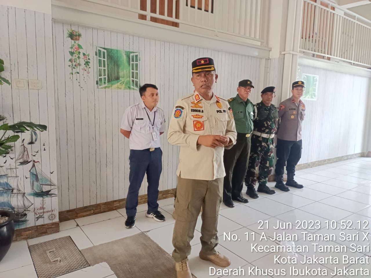 Kodam Jaya, Kodim 0503/JB – Anggota Koramil 01/Tamansari, Peltu Hadi bersama 4 personil Polres Jakarta Barat dan 3 personil Garnisun Barat melaksanakan pengamanan yang di dahului apel gabungan tiga pilar yang dilanjutkan monitoring giat pembongkaran paksa. Rabu 21 Juni 2023.