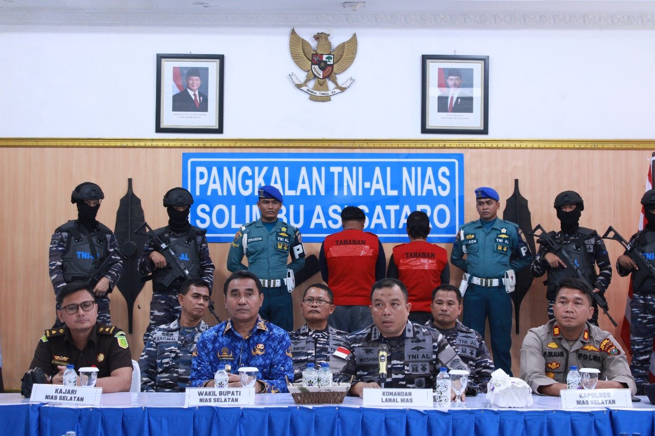 Kegiatan ilegal fishing yang melanggar UU Perikanan Nomor 31 Tahun 2004 tersebut diungkap kepada media dalam press release oleh Danlanal Nias Kolonel Laut (P) Wishnu Ardiansyah dihadiri FKPD Nias Selatan yaitu Bupati Nias Selatan diwakili Wakil Bupati Nias Selatan Ir. Yusuf Nache, S.T., M.M., Anggota DPRD Nias Selatan Amoni Zega, Mewakili Kejari Nias Selatan, dan Mewakili Kapolres Nias Selatan.