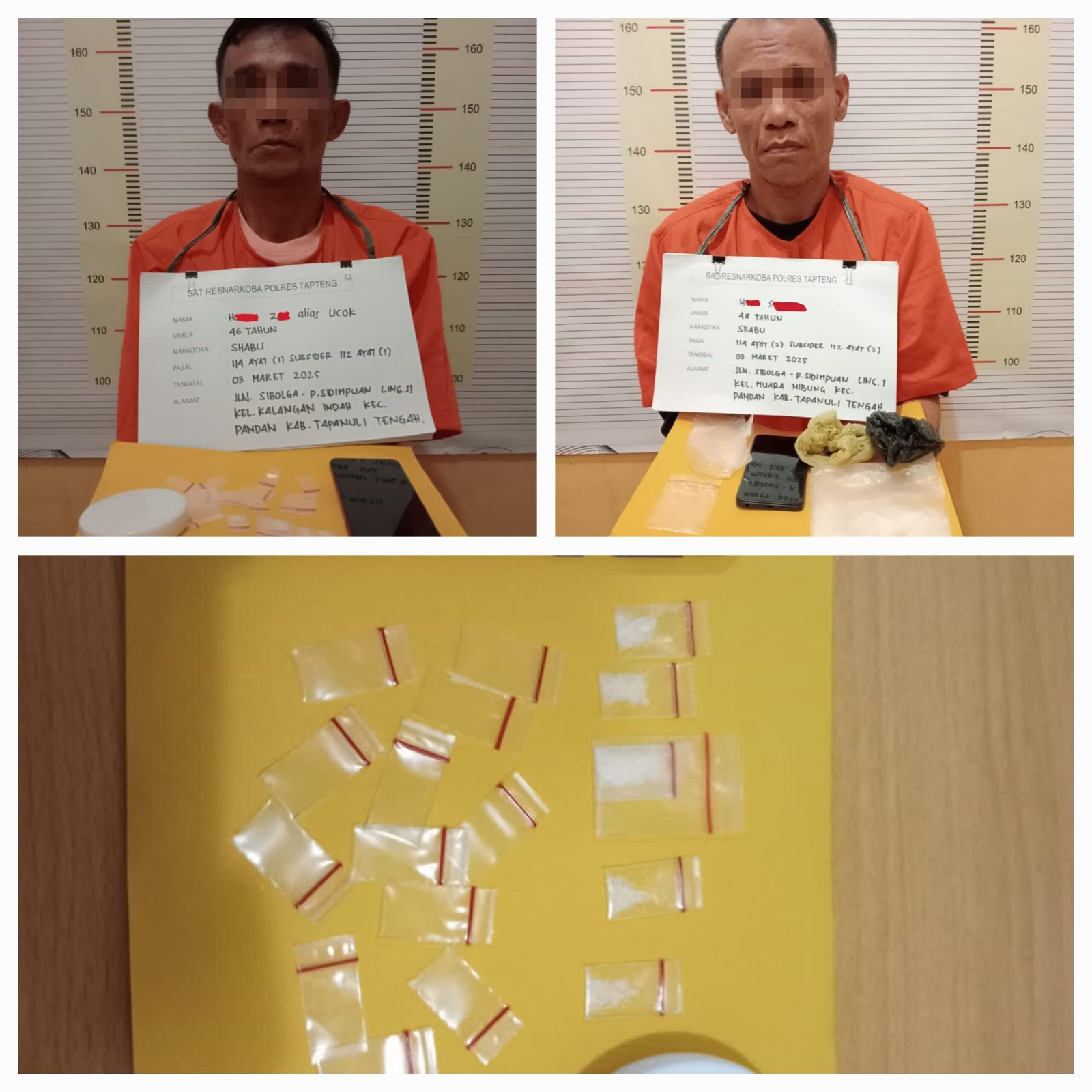 Kapolres Tapanuli Tengah AKBP Wahyu Endrajaya, SIK, M.Si melalui Kasat Narkoba AKP Gunawan Sinurat, SH, MH menjelaskan bahwa penangkapan kedua pelaku dilakukan dikedua rumah masing masing di Kel. Kalangan Indah Kec. Pandan Kab. Tapanuli Tengah.