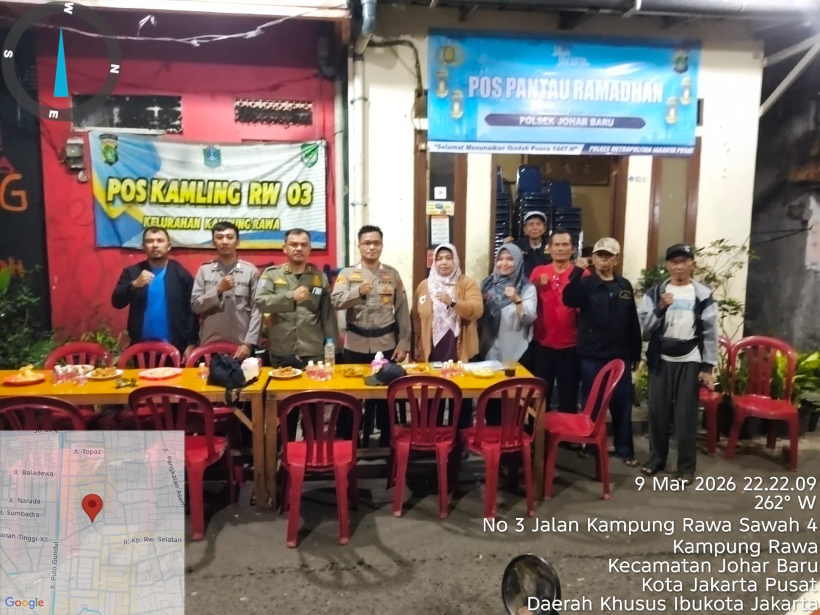 Kegiatan tersebut berlangsung pada Senin (9/3/2026) pukul 21.00 WIB di Pos Pantau Jalan T yang berlokasi di Jalan Rawa Sawah Raya RT 07 RW 03, Kelurahan Kampung Rawa. Pos pantau ini menjadi salah satu titik pengawasan guna mengantisipasi potensi gangguan kamtibmas pada malam hari selama bulan Ramadhan.