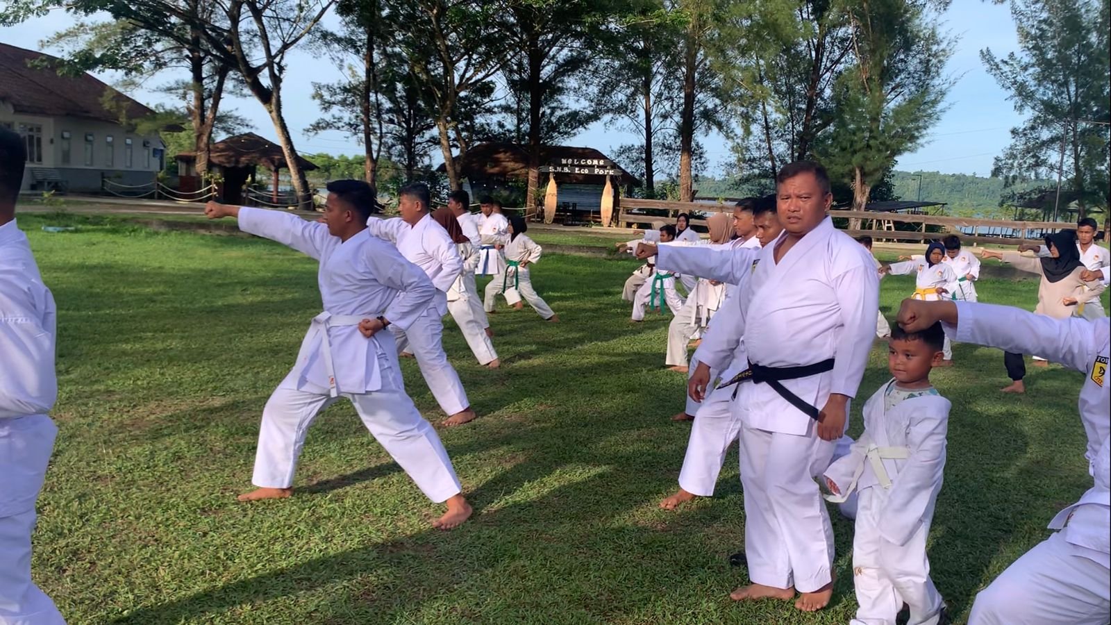 Komandan Lanal Simeulue Letkol Laut (P) Dwi Herdian Saputra, M.Tr.Opsla., yang juga pemegang sabuk hitam (Dan 1) Karate turun langsung melatih Prajurit Lanal Simeulue.