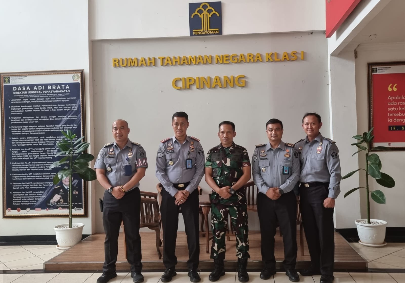 Dandim 0505/JT Letkol Arm Suyikno,S,Sos,M,Si, dalam kunjungannya ke Lembaga Pemasyarakatan Kelas I dan Narkotika Kelas II A Cipinang ini dalam rangka mempererat tali silaturahmi dengan Karutan Sukarno Ali, AMD,IP, SH,M,Si, KPR Rutan Febrian Sony, Amd,SIP,M,Si, Kalapas Narkotika Veronika Afandi, AMD,IP,SH,MH, KPLP Narkotika M.Khafi, Amd,IP,S,Sos,M,Si, bersama Staf Lapas.