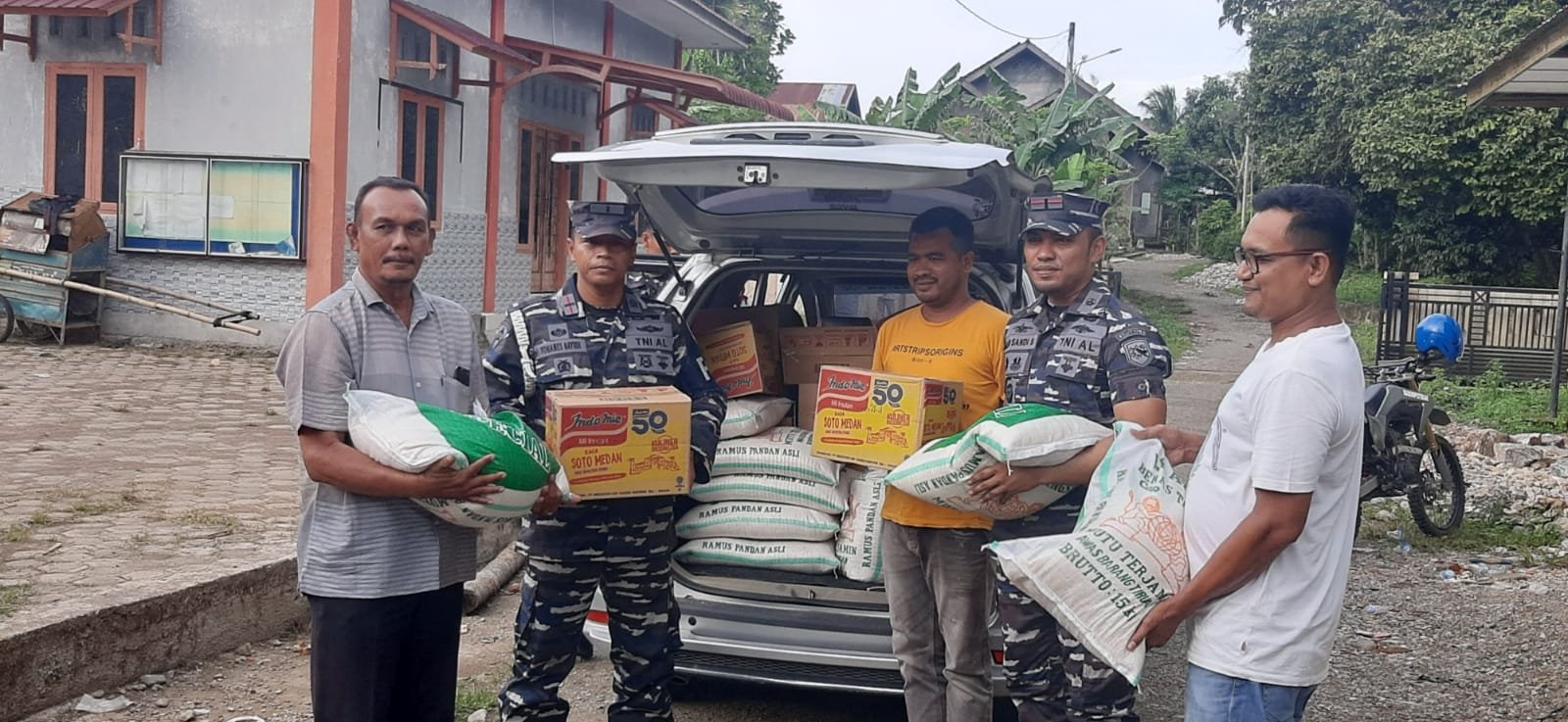 PgS. Komandan Posal Malahayati Letda Laut (S) Boy Sandi Simamora dan PgS. Komandan Posal Lhoknga Letda Laut (PM) Yohanes Bayudi beserta anggota menyerahkan sembako berupa beras dan indomie diterima oleh Keuchik Gampong Teupin Batee dan Keuchik Gampong Cot Leuot.