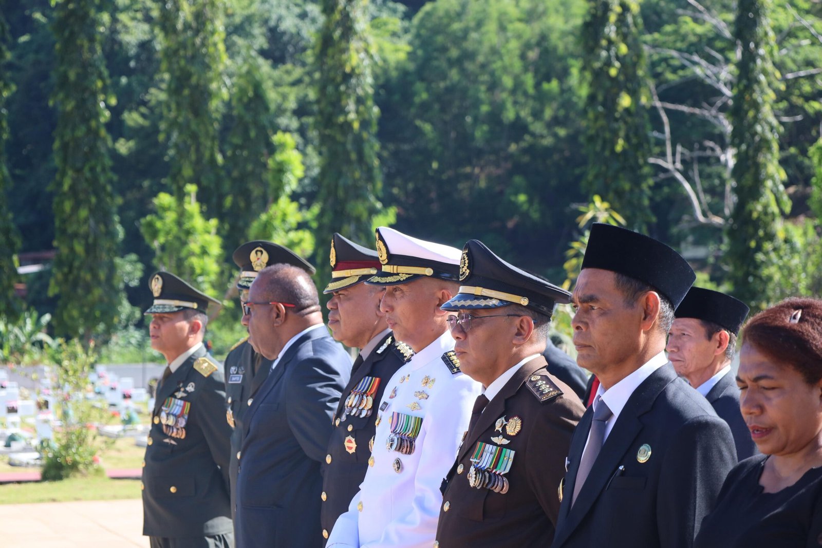 Ziarah ini turut diikuti sekitar 150 Personel Gabungan TNI (AD, AL, AU), Polri, serta Pemerintah Daerah, dengan jajaran Pejabat Tinggi seperti Marsma TNI Mokh. Mukhson, Brigjen TNI Thevi A. Zebua, dan Kombes Pol Jeremias Rontini, yang mempertegas soliditas dan sinergi di Bumi Cenderawasih.