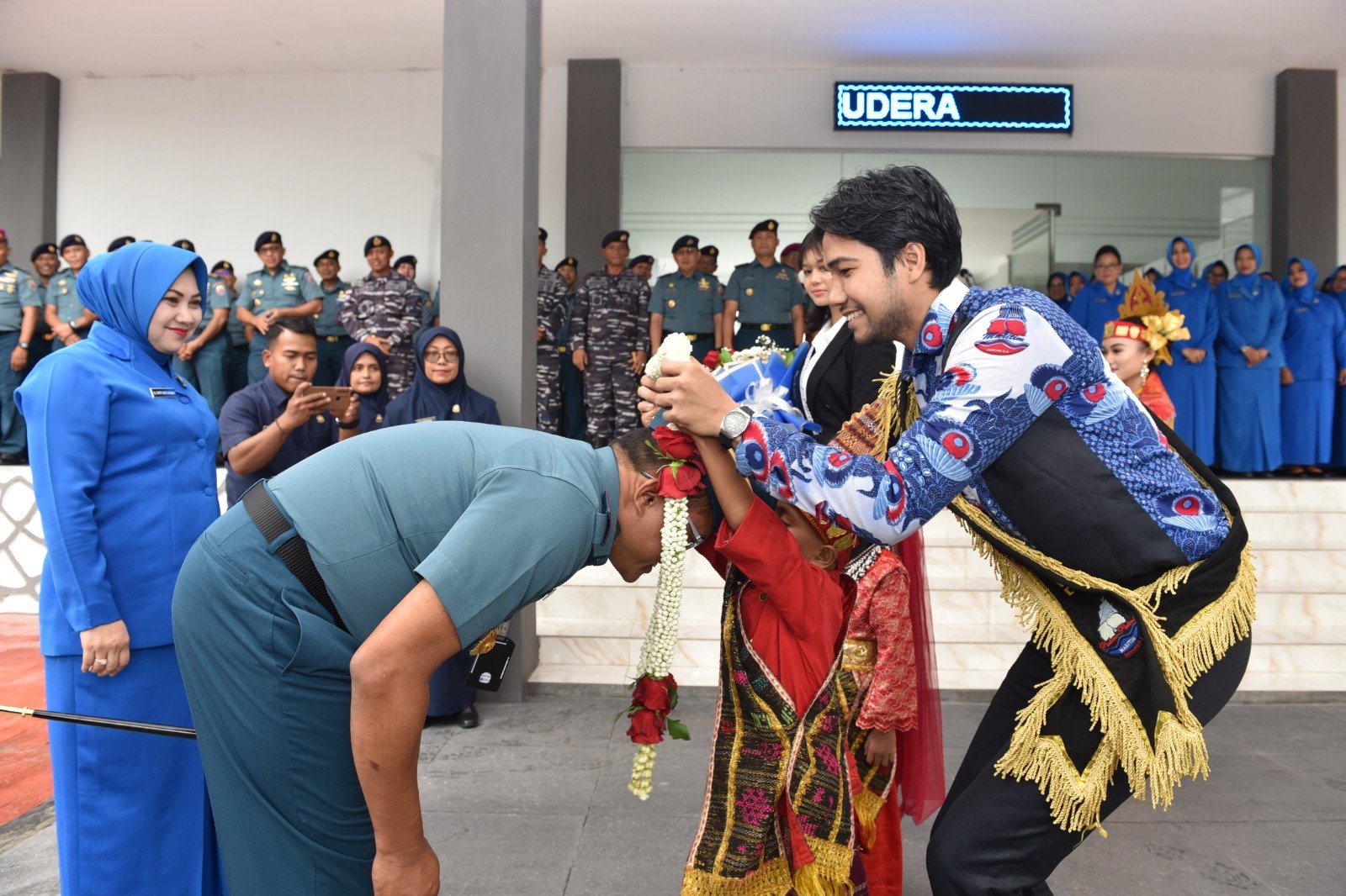 Selanjutnya Wadan Lantamal I Kolonel Marinir Sudin Kaban didampingi Ny. Dwi Sudin Kaban memakaikan Kain Ulos, sebagai ciri khas masyarakat Suku Batak yang bermakna suatu penghormatan atas kedatangan pejabat baru sebagai Komandan Lantamal I.