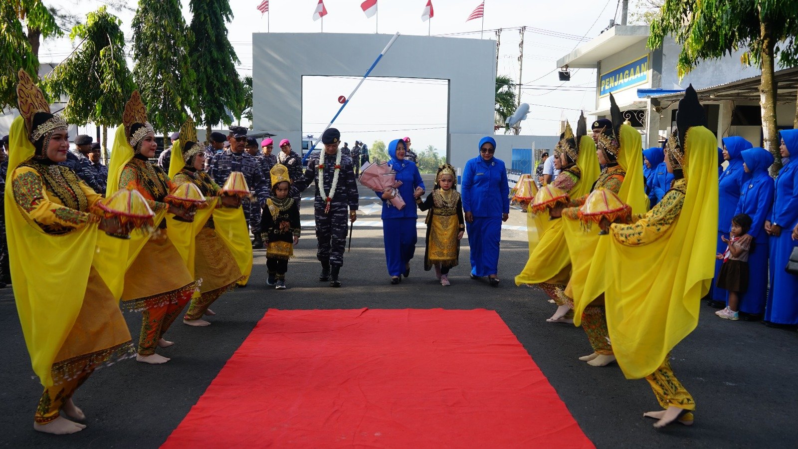 Komandan Lanal Lhokseumawe Letkol Laut (P) Andi Susanto berserta Ketua Cabang 6 Korcab I DJA I Ny. Yuanita Andi Susanto menerima Tradisi Prosesi Adat Peusijuk (Tepung Tawar) oleh Prajurit Lanal Lhokseumawe di Markas Komando Pangkalan TNI AL Lhokseumawe, Jalan Raya PT. KKA KM 2, Kelurahan Palo Igeuh, Kecamatan Dewantara, Kabupaten Aceh Utara,