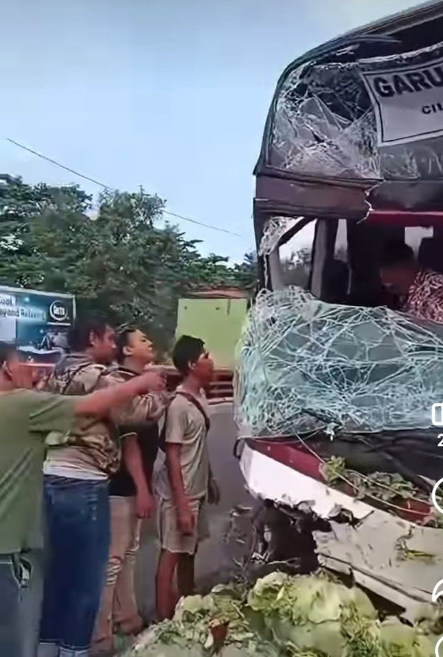 Posisi bus hancur di bagian kaca depan. Sebagian bodi ringsek.