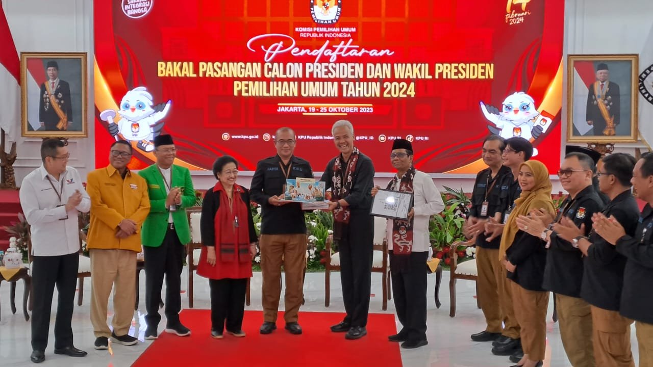 Pasangan Bakal Calon Presiden (Bacapres) dan Bakal Calon Wakil Presiden (Bacawapres) Ganjar Pranowo-Mahfud MD mendaftar ke Komisi Pemilihan Umum (KPU) sebagai Capres-Cawapres 2024 mendatang. Kamis (19/10/2023).