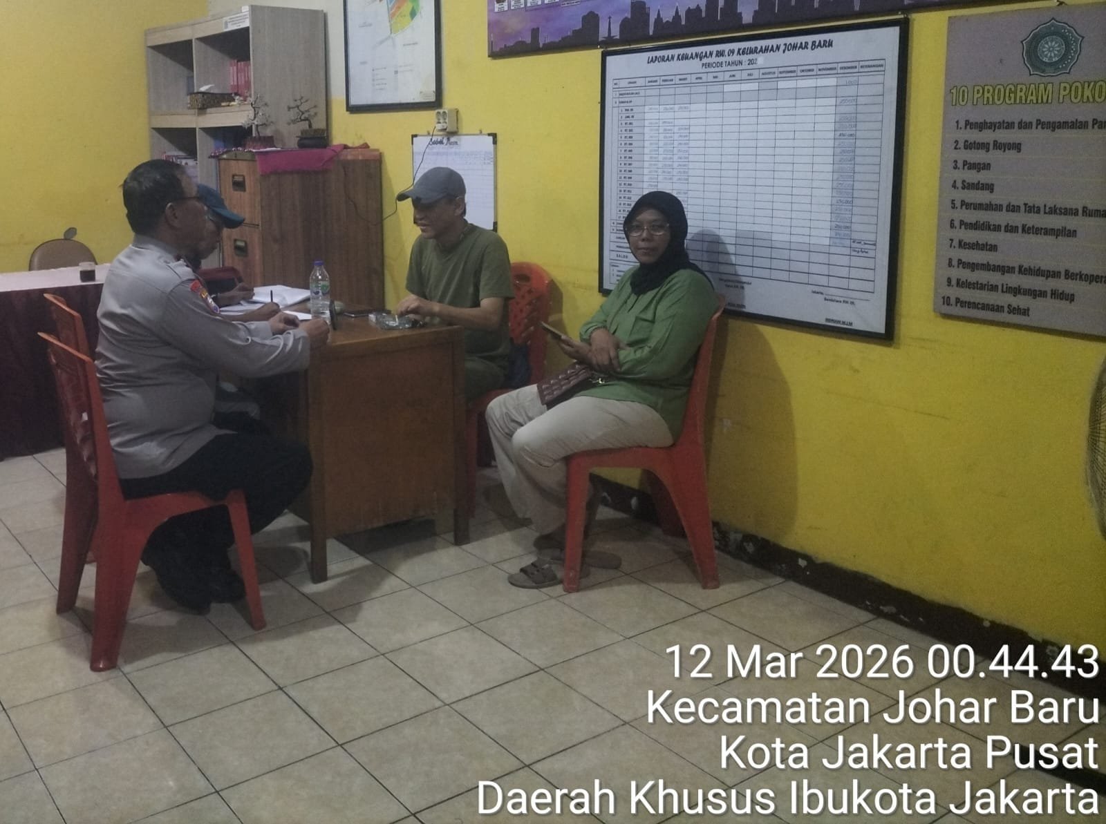 Jakarta Pusat – Guna mempererat komunikasi dengan masyarakat serta menjaga situasi keamanan lingkungan, Bhabinkamtibmas Kelurahan Johar Baru melaksanakan kegiatan patroli wilayah sekaligus sambang warga di Sekretariat RW 09, Jalan Johar Baru I RW 09, Kelurahan Johar Baru, Kecamatan Johar Baru, Jakarta Pusat, pada Kamis (12/2/2026) sekitar pukul 00.30 WIB.