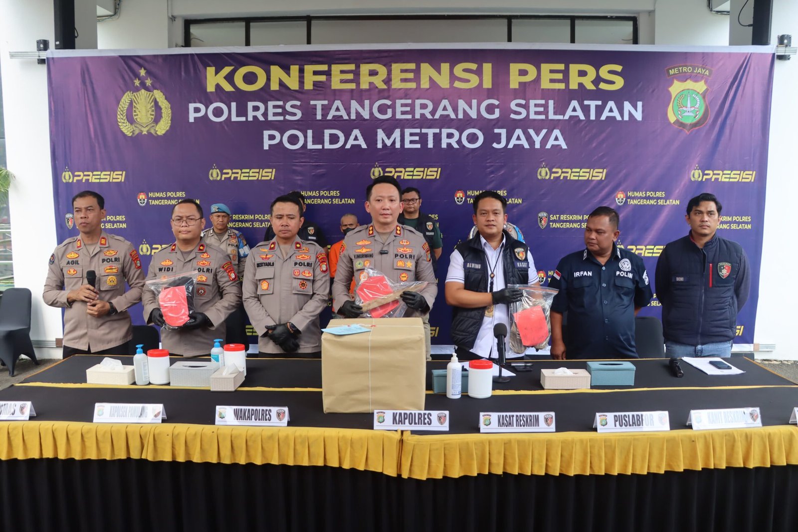 Hadir juga dalam konferensi pers tersebut Wakapores Tangsel, Kompol Rizkyadi Saputro, S.I.K., Kapolsek Pamulang Kompol Widya Agustiono, S.E., S.I.K Kasat Reskrim AKP Alvino Cahyadi, S.T.K., S.I.K. dan Kasi Humas AKP M Agil Sahril, S.H.