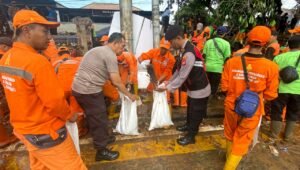 Jakarta – Pihak Kepolisian bersama unsur 3 Pilar berjibaku membersihkan puing dan sampah akibat tanggul jebol di TL Hek , Jl. Raya Bogor Kramatjati Jakarta Timur. Senin (25/03/2024) pagi.