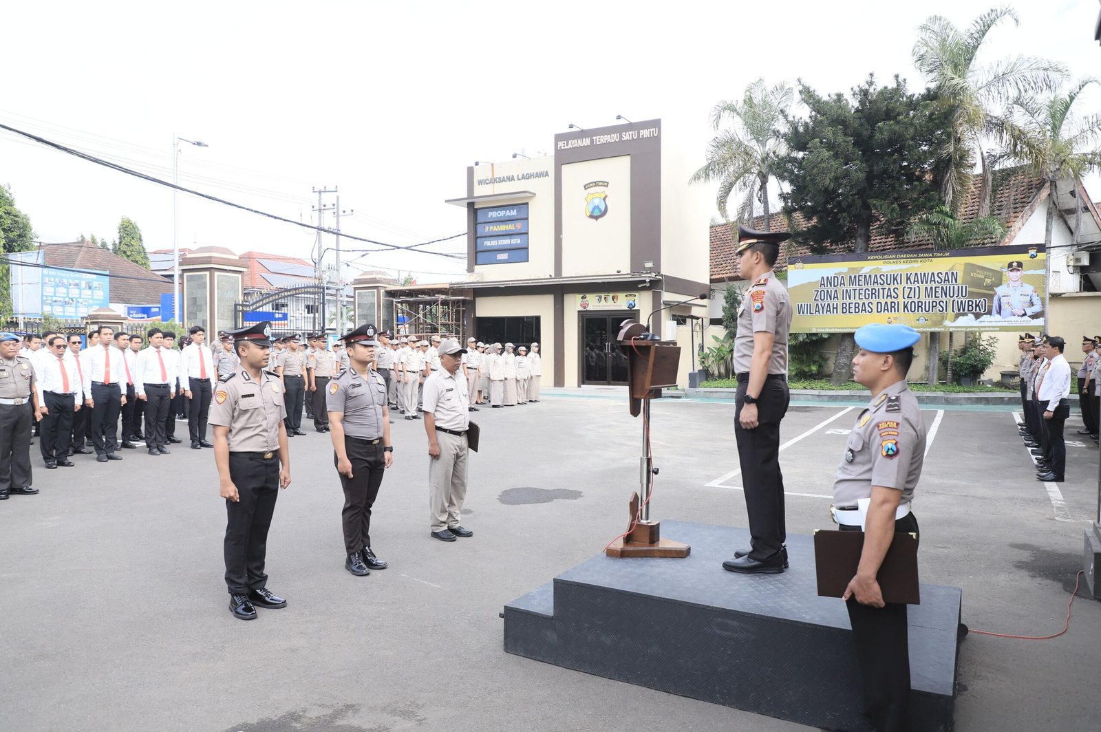 Kegiatan apel diawali dengan pembacaan Asmaul Husna, doa, Mars Polri, penghormatan pasukan dan laporan Komandan Apel kepada pimpinan apel, dilanjutkan dengan pengucapan Tri Brata, Catur Prasetya, serta pembacaan Panca Prasetya Korpri.