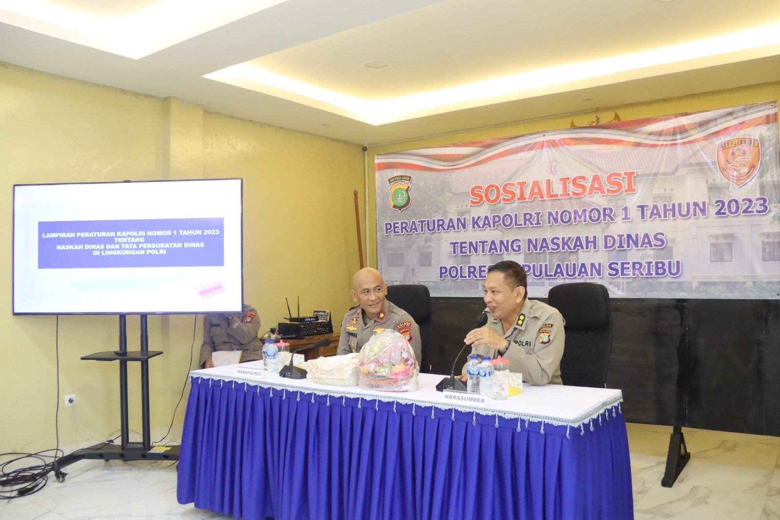 Jakarta- Wakapolres Kepulauan Seribu, Kompol Zaroki Saputra, S.H., memimpin kegiatan Sosialisasi Peraturan Kepala Kepolisian Negara Republik Indonesia Nomor 1 tahun 2023 tentang Naskah Dinas dan Tata Persuratan di lingkungan Kepolisian Negara Republik Indonesia. Acara berlangsung di Aula Wicaksana Laghawa Polres Kepulauan Seribu, Kamis (12/10/2024).