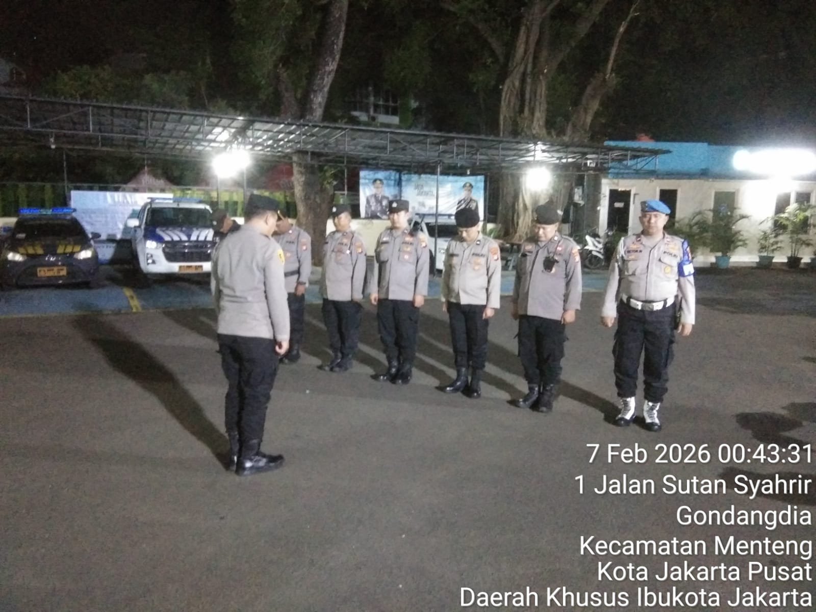 Jakarta Pusat – Dalam rangka mengantisipasi gangguan keamanan dan ketertiban masyarakat (kamtibmas), khususnya potensi tawuran warga serta kejahatan pada malam hari, Polsek Metro Menteng melaksanakan apel patroli cipta kondisi di wilayah Menteng dan sekitarnya, Jakarta Pusat. Kegiatan ini dipimpin langsung oleh Wakapolsek Metro Menteng, Kompol Bambang Santoso, sebagai bentuk kesiapsiagaan personel dalam menjaga kondusivitas wilayah. Sabtu (7/2/2026)