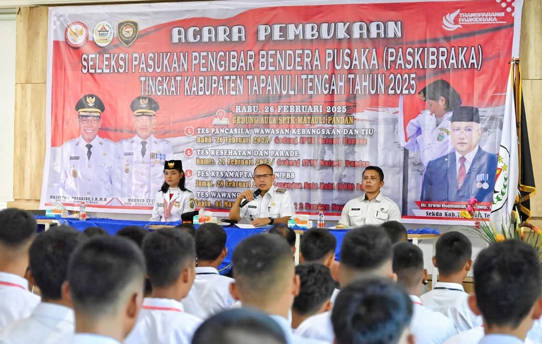 PANDAN-Wakil Bupati Tapanuli Tengah Mahmud Efendi, membuka dengan resmi seleksi Pasukan Pengibar Bendera Pusaka (Paskibraka) Tingkat Kabupaten Tapanuli Tengah Tahun 2025, bertempat di Gedung STPK Matauli Pandan, Rabu (26/2/2025).