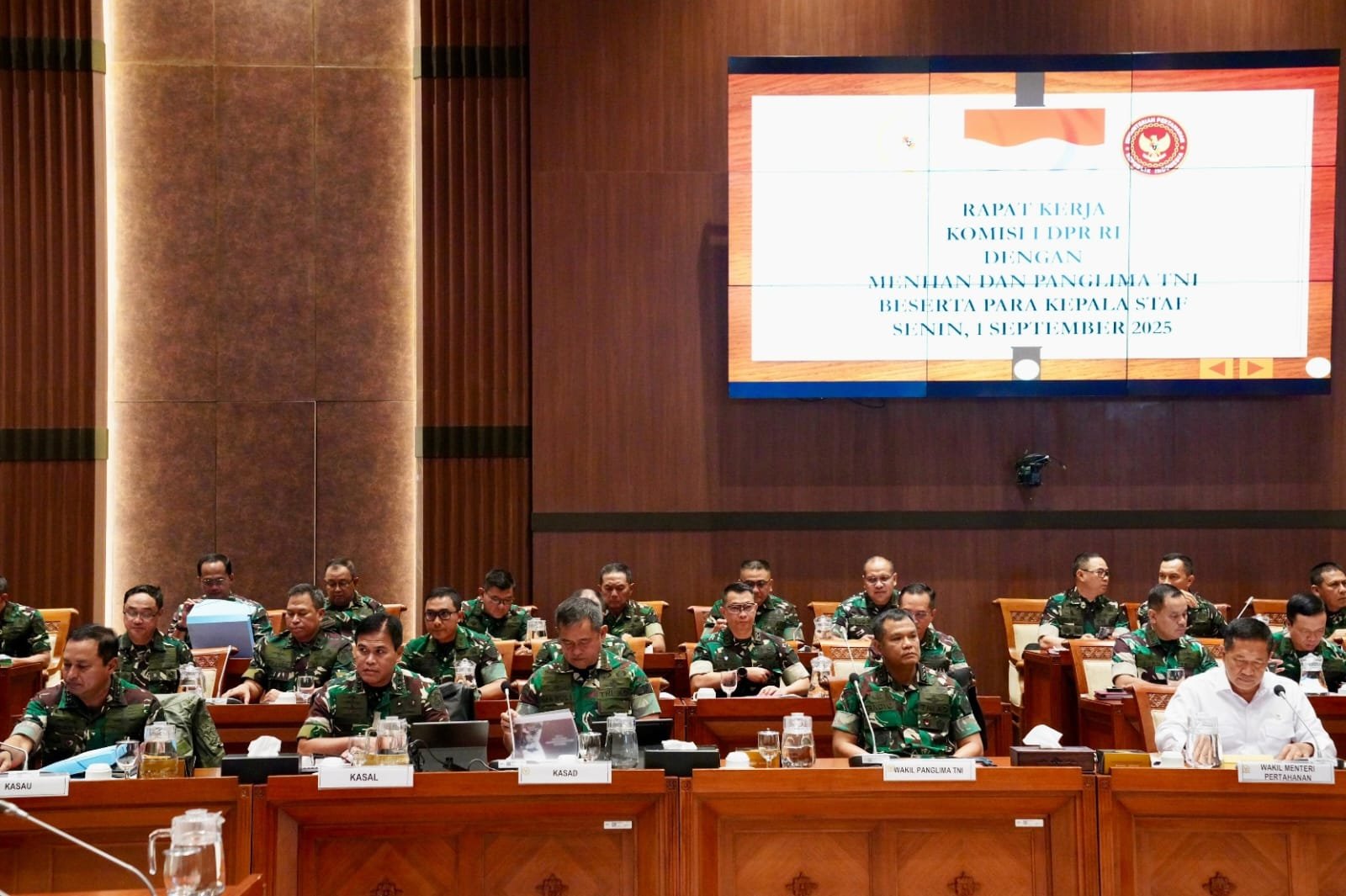 refubliknews.com,- (Puspen TNI). Wakil Panglima TNI Jenderal TNI Tandyo Budi R bersama Wakil Menteri Pertahanan Republik Indonesia (Wamenhan RI) Donny Ermawan Taufanto, didampingi para Kepala Staf Angkatan menghadiri Rapat Kerja bersama Komisi I Dewan Perwakilan Rakyat (DPR RI), bertempat di Ruang Rapat Komisi I DPR RI, Kompleks Gedung MPR/DPR, Senayan, Jakarta Pusat, Senin (01/09/2025).