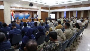 Walikota Kota Administrasi Jakarta Utara, Ali Maulana Hakim membuka Sosialisasi Program Penyediaan Air Minum Perpipaan oleh PAM JAYA di Ruang Fatahillah, Lantai 2 Kantor Walikota Kota Administrasi Jakarta Utara, Senin (26/2). Kegiatan yang dihadiri camat lurah ini bertujuan untuk mencapai target 100 persen pelayanan pada tahun 2030.