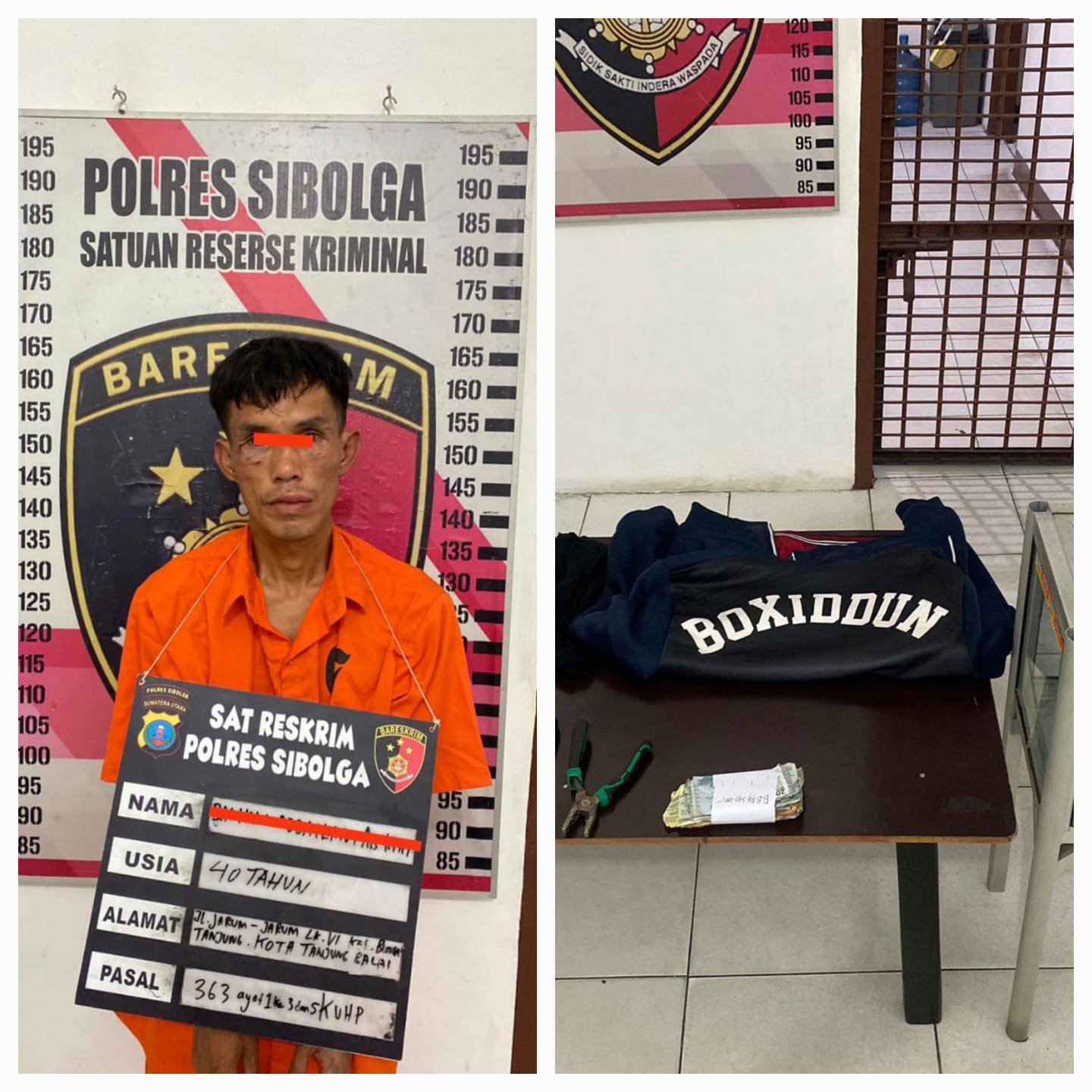 Pada hari Selasa siang, 04 Juni 2024, sekitar pukul 12.30 WIB, Tim Opsnal Sat Reskrim Polres Sibolga, Bhabinkamtibmas Kelurahan Pasar Belakang, KA Pol Sub Sektor Kota, dan DPD BKPRMI Kota Sibolga berhasil mengamankan seorang terduga Pelaku, BHA alias K (40) Tahun, warga Jl. Jarum-Jarum, Kelurahan Bunga Tanjung, Kecamatan Datuk Bandar Timur, Kota Tanjung Balai. Pelaku beserta Barang Bukti berupa satu kotak infak, dua buah gembok, pakaian yang dikenakan saat aksi, serta peralatan yang digunakan untuk membongkar Kotak Infak, dan uang tunai sebesar Rp. 340.000,- diamankan ke Mako Polres Sibolga untuk diproses lebih lanjut, Ujar Kasat.